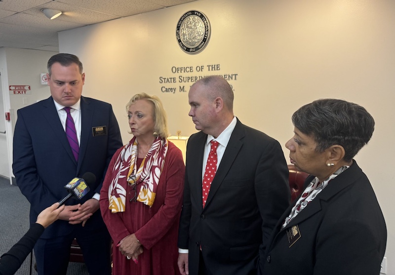 State Superintendent Carey Wright, second from left, at a September news conference at the Maryland State Department of Education building. Board of Education President Joshua Michael, left, listens. (File photo by William J. Ford/Maryland Matters)