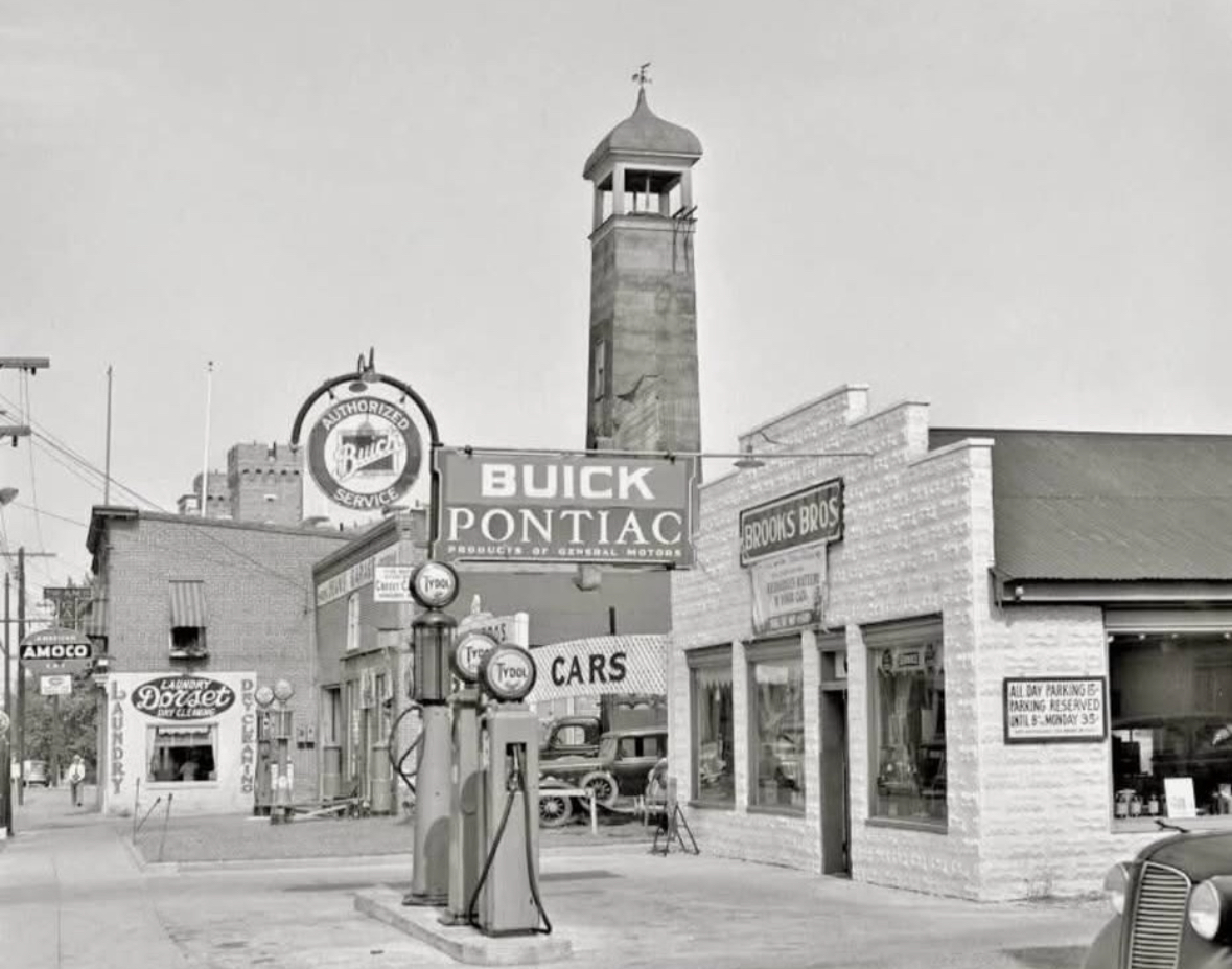 The Brooks Brothers Buick dealership was situated on Gay Street in the early-to-mid 20th century, with the showroom sitting in front of the garage bays. The company became Johnson Motors in the late 1960s. The original building was torn down around 1969, and a new white brick showroom with offices was built. Chesapeake Equipment bought the property and operated there until they closed. Blue Ruin is now on the property.