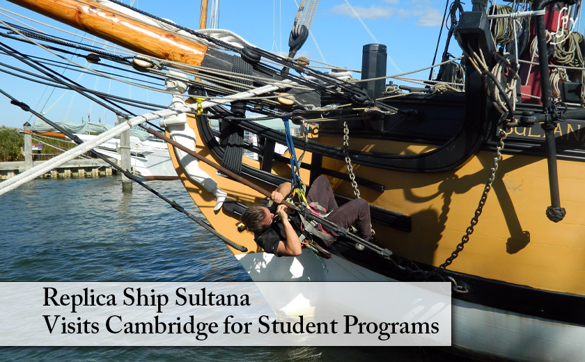 The 18th-century replica schooner Sultana is docked in Cambridge at Long Wharf this week and next, offering exclusively two-hour sails and lessons in Chesapeake Bay history to grade-school students.