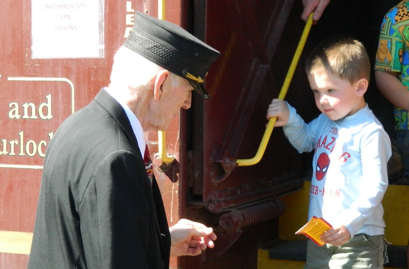 A young passenger surrenders his ticket to conductor Tom Posatko, a member of the Wilmington, DE, chapter of the National Railway Historical Society. Postatko has volunteered at the Hurlock Festival for the last 15 years.