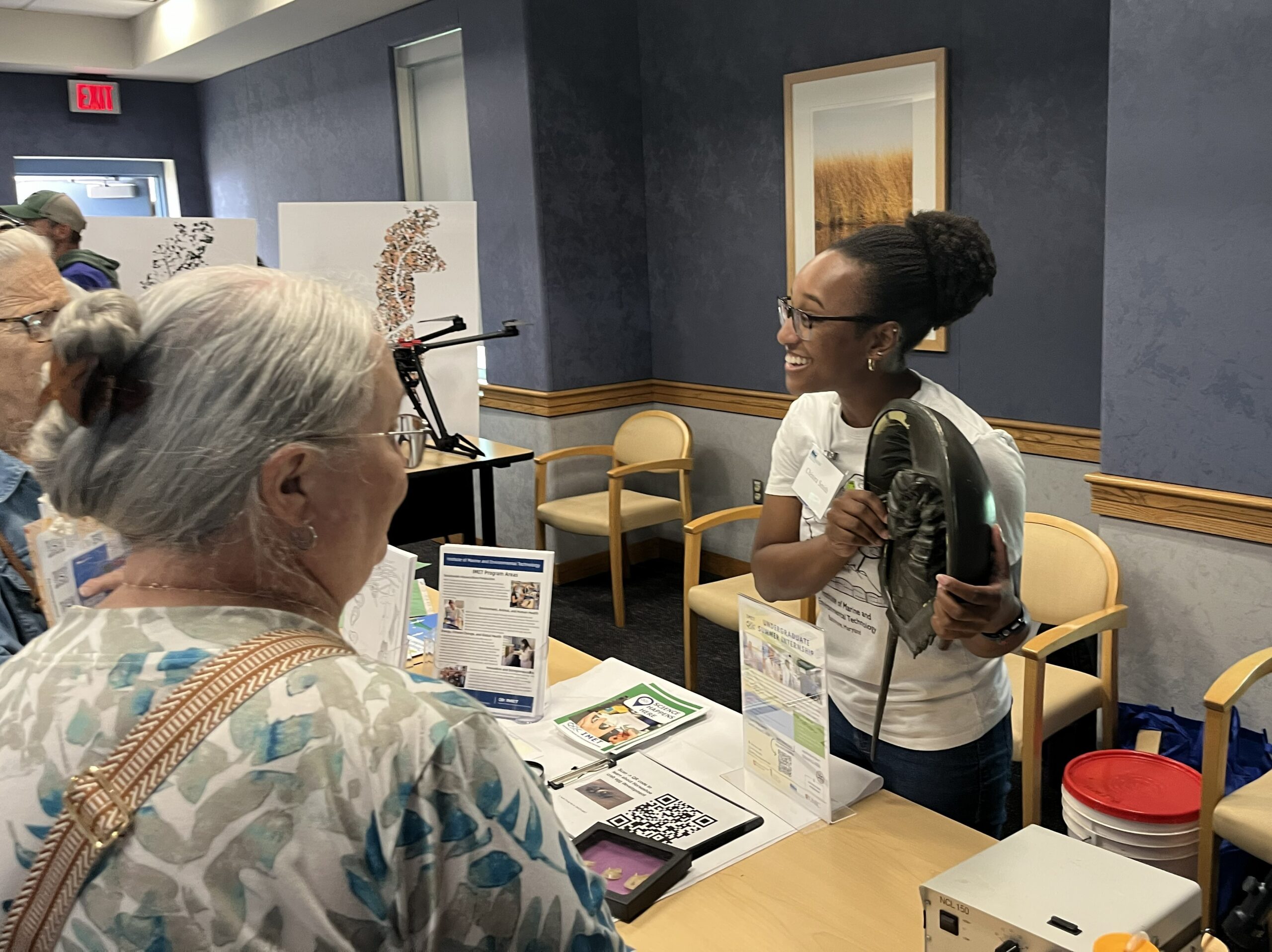 Chenira Smith, Outreach Coordinator with the UMCES Institute of Marine & Environmental Technology discusses the finer points of horseshoe crabs with some older kids at the Open House.