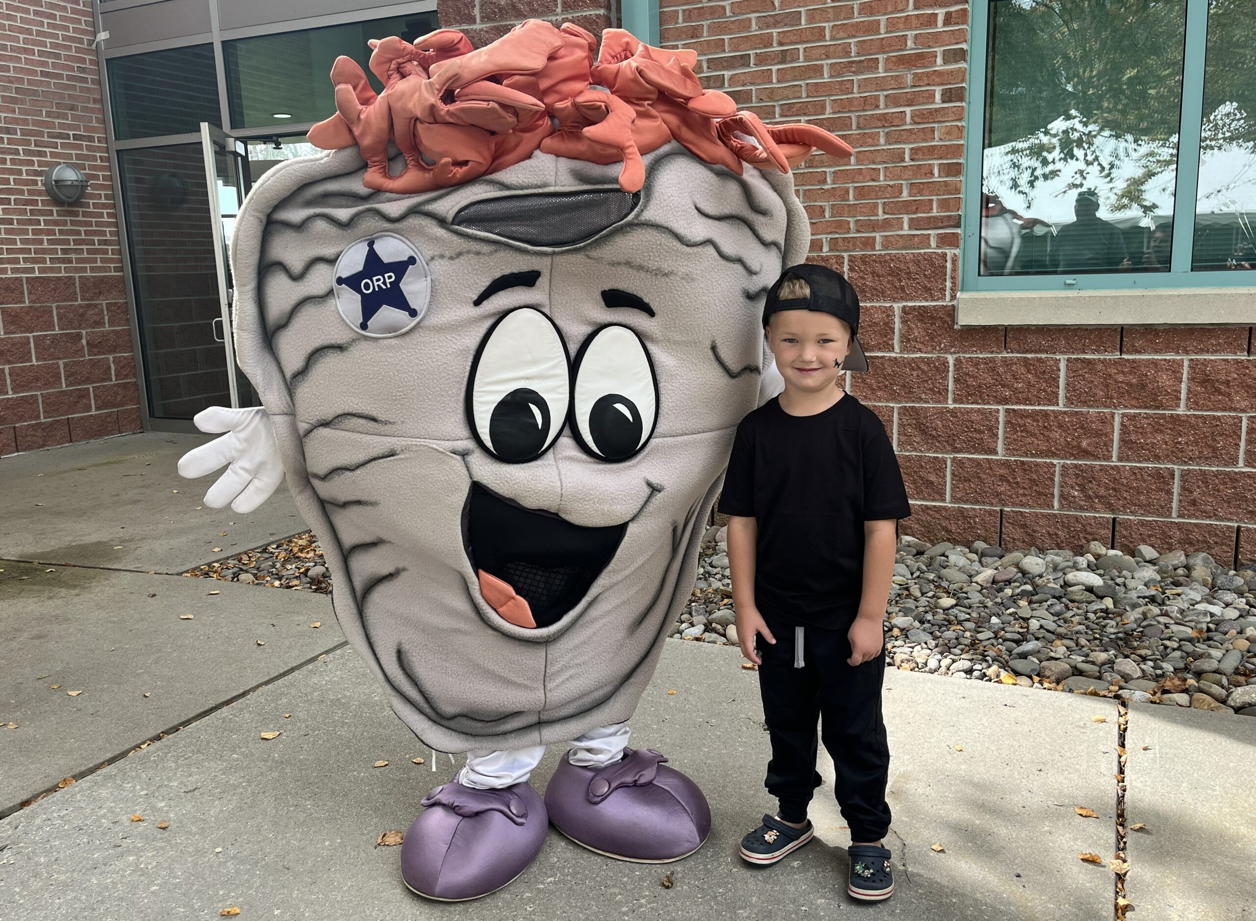 Carter Trader, 4, of East New Market, came to the Open House with his sister and grandparents. Here he is with Shelly, mascot of the Oyster Recovery Project.