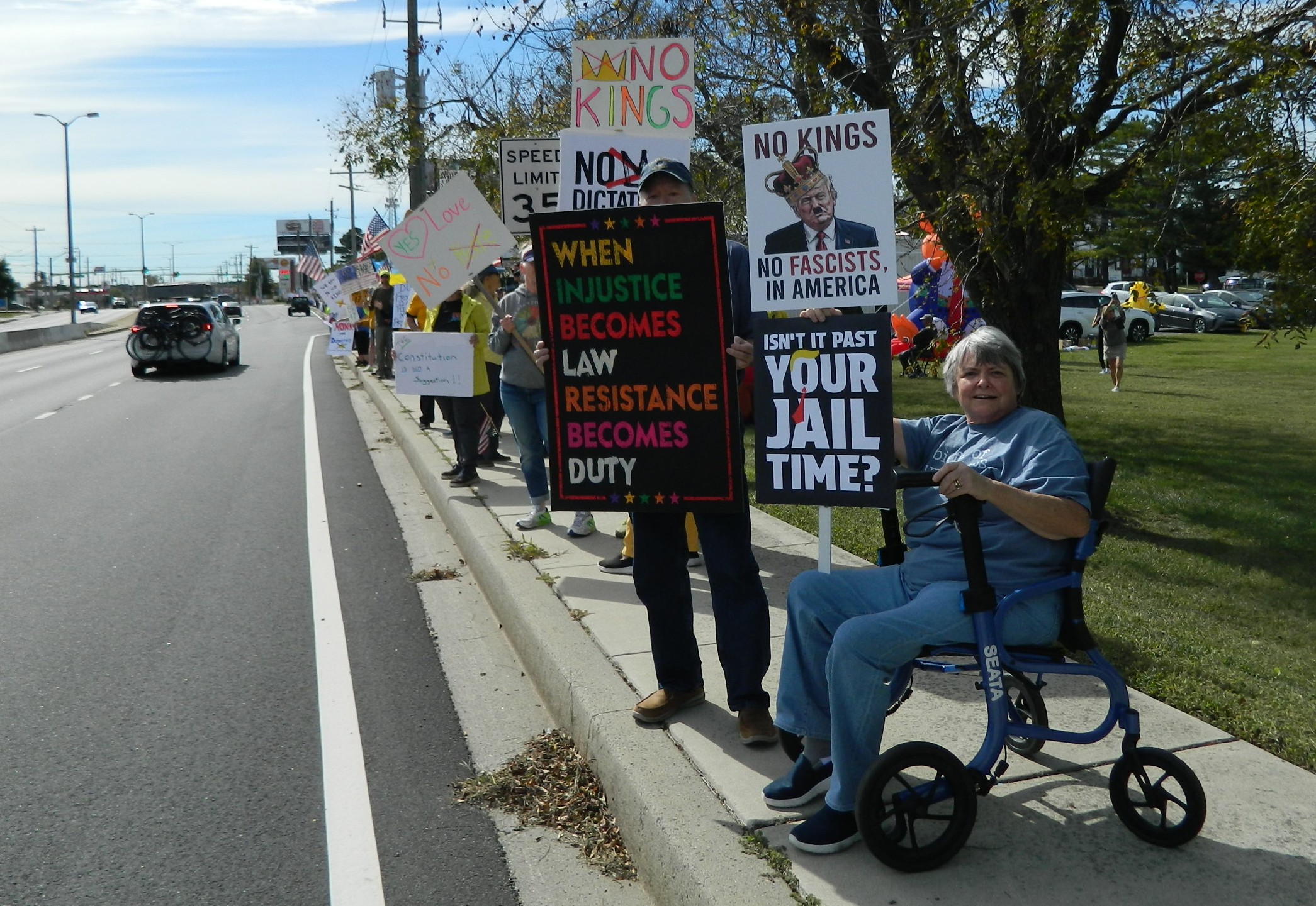 For two hours Saturday afternoon, national politics intersected with the flow of traffic as nearly 400 people, old and young, a dozen-odd dogs, and a bevy of costumed characters held placards and chanted slogans as part of the network of the more than 2,700 “No Kings” rallies that took place across all 50 states.