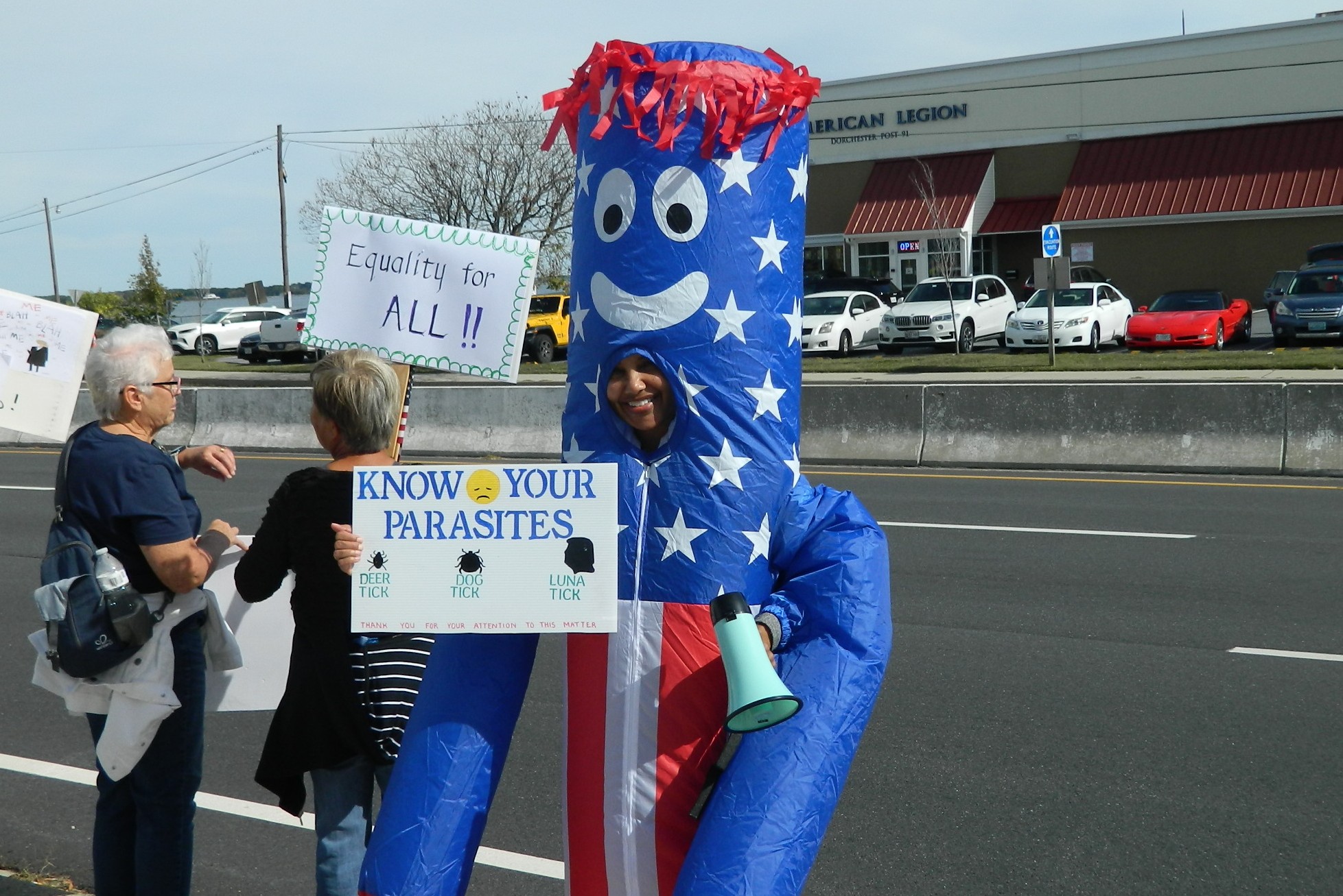 Some participants said that getting people to come out was as important as making a clever sign or donning a costume. Steve Levin, of Cambridge, said he worked his network all week to ensure maximum participation. “I’ve been telling everyone I know to get a little courage,” he said. “And as a result, a lot of people who have never done anything like this before are out here today. It’s helped. The turnout is great.”