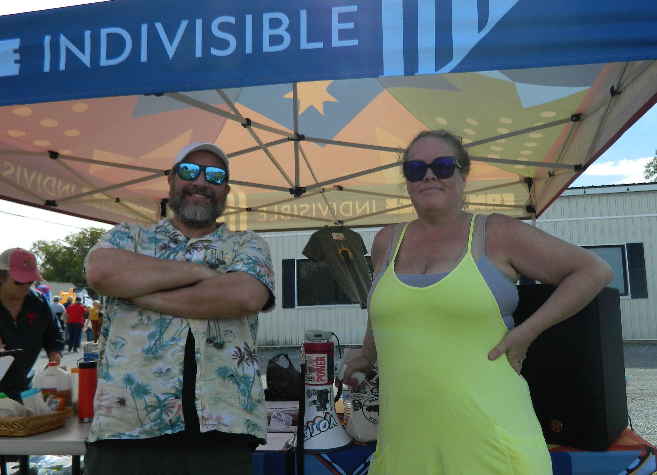 Rally organizers Andy and Michelle Fowle talk to The Spy in front the kiosk for their ‘Cambridge Indivisible’ civic organization.