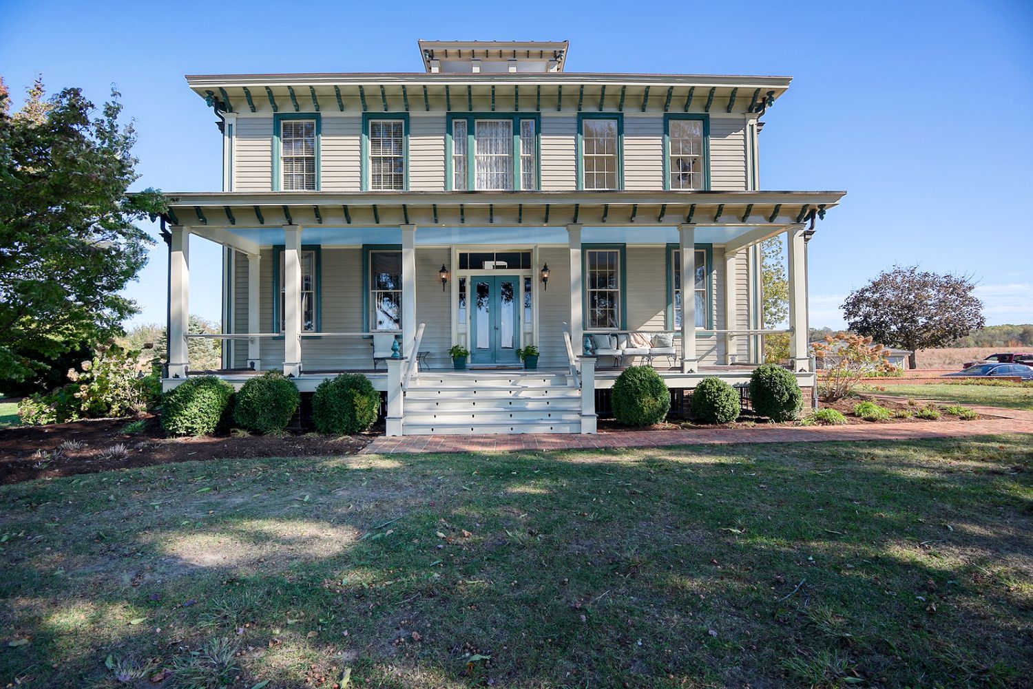 This exquisite four parcel, sixty-five acre property is listed on the National Register of Historic Places and is located on one of Kent County’s highest points, at the intersection of two state routes near Chestertown. The two-story, five-bay wide, two bays deep, center hall plan was built in 1858, during the transition from Greek Revival to Italianate architectural styles. From its high vantage point, the house sits in a well maintained landscape of lawn, mature shade trees, woods, wild flowers, native prairie grasses and a large pond. The house’s shallow hipped roof is topped by a belvedere that offers stunning 360 degree vistas of the surrounding area.