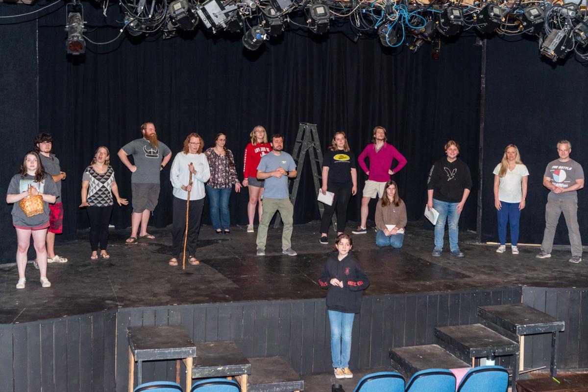 The cast of Church Hill Theatre’s Into the Woods rehearses the song The First Midnight, warning the Baker and his wife of the short time they have to reverse the Witch’s curse. Left to right: Mackenzie Carroll, Ian Stotts, Jessie Duggan, Zack Schlag, Heather Joyce-Byers ( the Witch), Kelly Ostazeski, , Abigail Gilbert, Mark Wiening (the Baker), Erin Bradley, J. W. Ruth, Maria Boone, Caleb Ford, Becca Van Aken (The Baker’s Wife), Jeff Daly and center Noelle Wheeler.