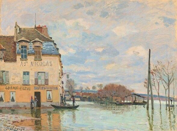 Water was another of Sisley’s favorite subjects, and he frequently painted bridges over water and landscapes including rivers. His ability to observe sunlight, movement, and reflections on water was unique. Four years after the 1872 flood, Sisley painted seven pictures of the 1876 flood. At that time, he was able to chronicle the flood from the beginning to the end. As the flood increased, the village of Port Marly was submerged. “Flood at Port Marly” (1876) (19.5’’ x 24’’) depicts the waters of the Seine flowing across the street. Sisley set up his easel around the corner from the Restaurant a Saint Nicholas, the second building on the left. A coach drawn by white horses appears with luggage piled high. Rows of trees, rowers in a boat, and the dark roofed shed can be seen across the street.