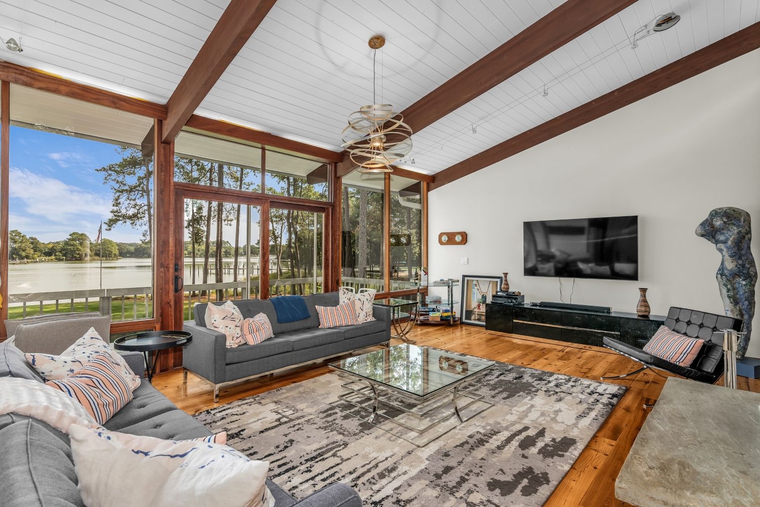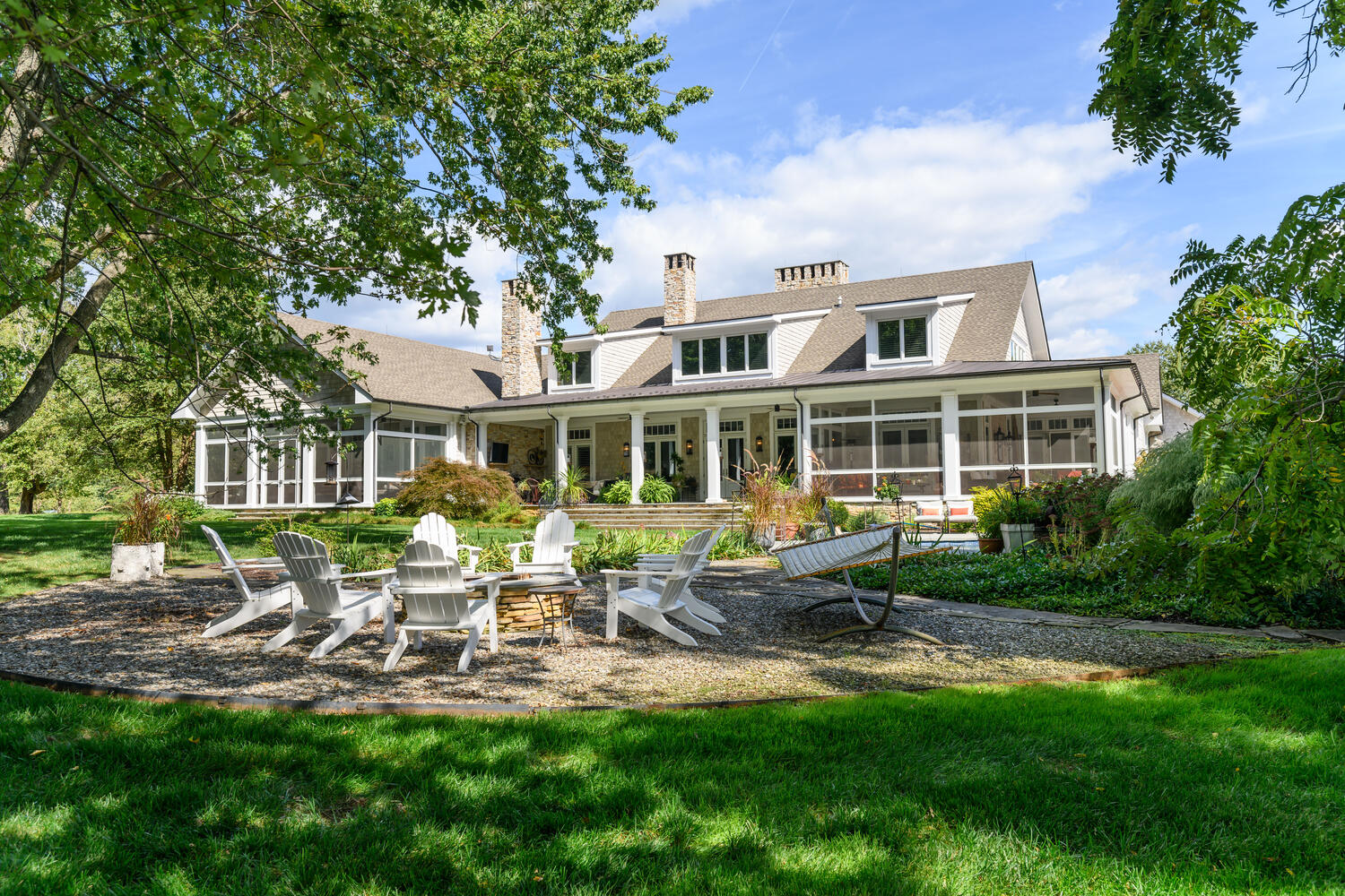 A wrap-around screened porch offers seamless flow from indoor spaces to outdoor entertaining areas.