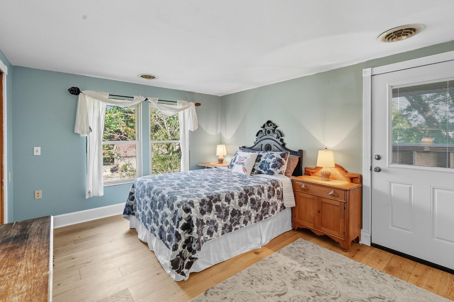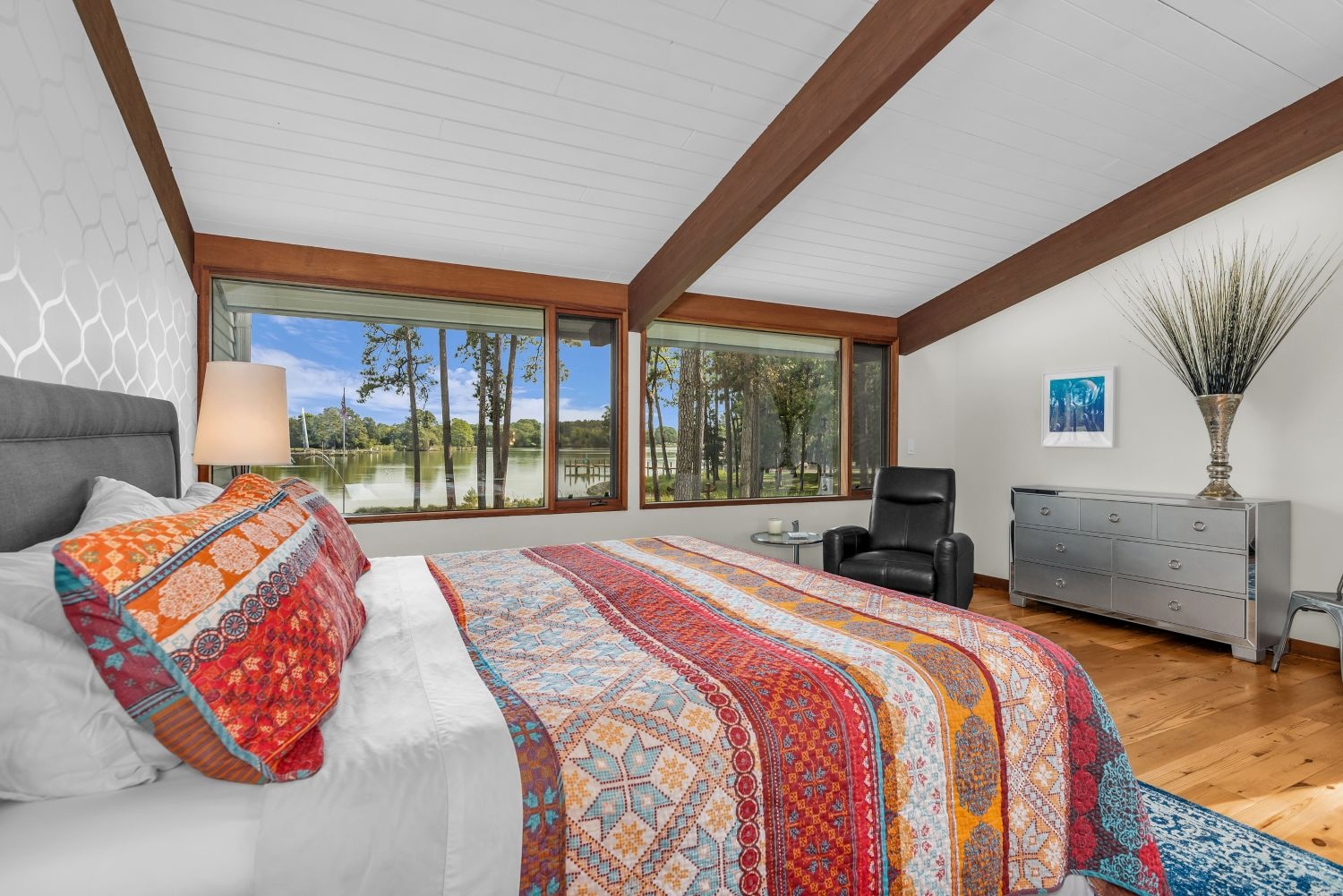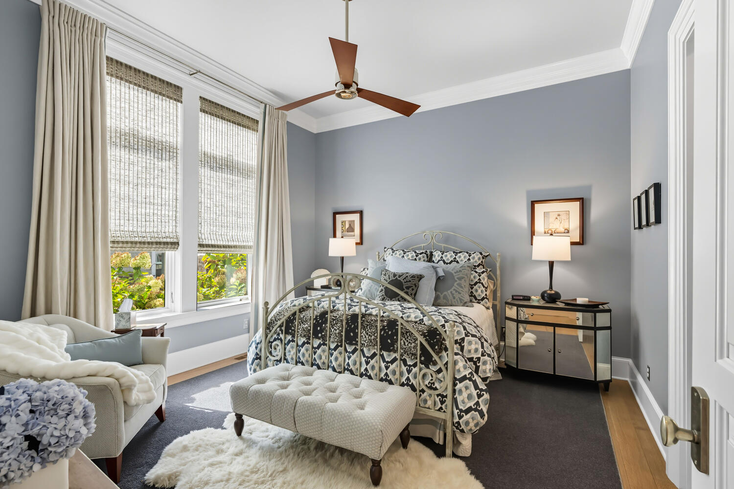 The house is zoned very well with the main floor bedrooms being far apart from each other for privacy. This guest bedroom is located off the secondary hall from the foyer and its large double unit window overlooks the side terrace. The gray walls, colorful duvet and pillows creates a serene spot for sleep.