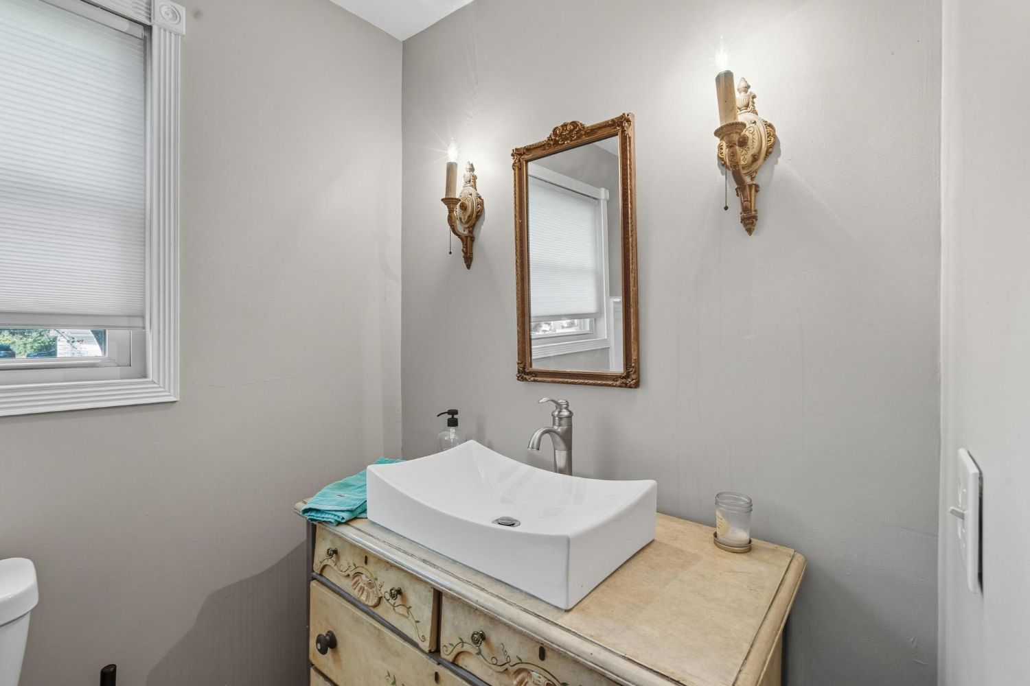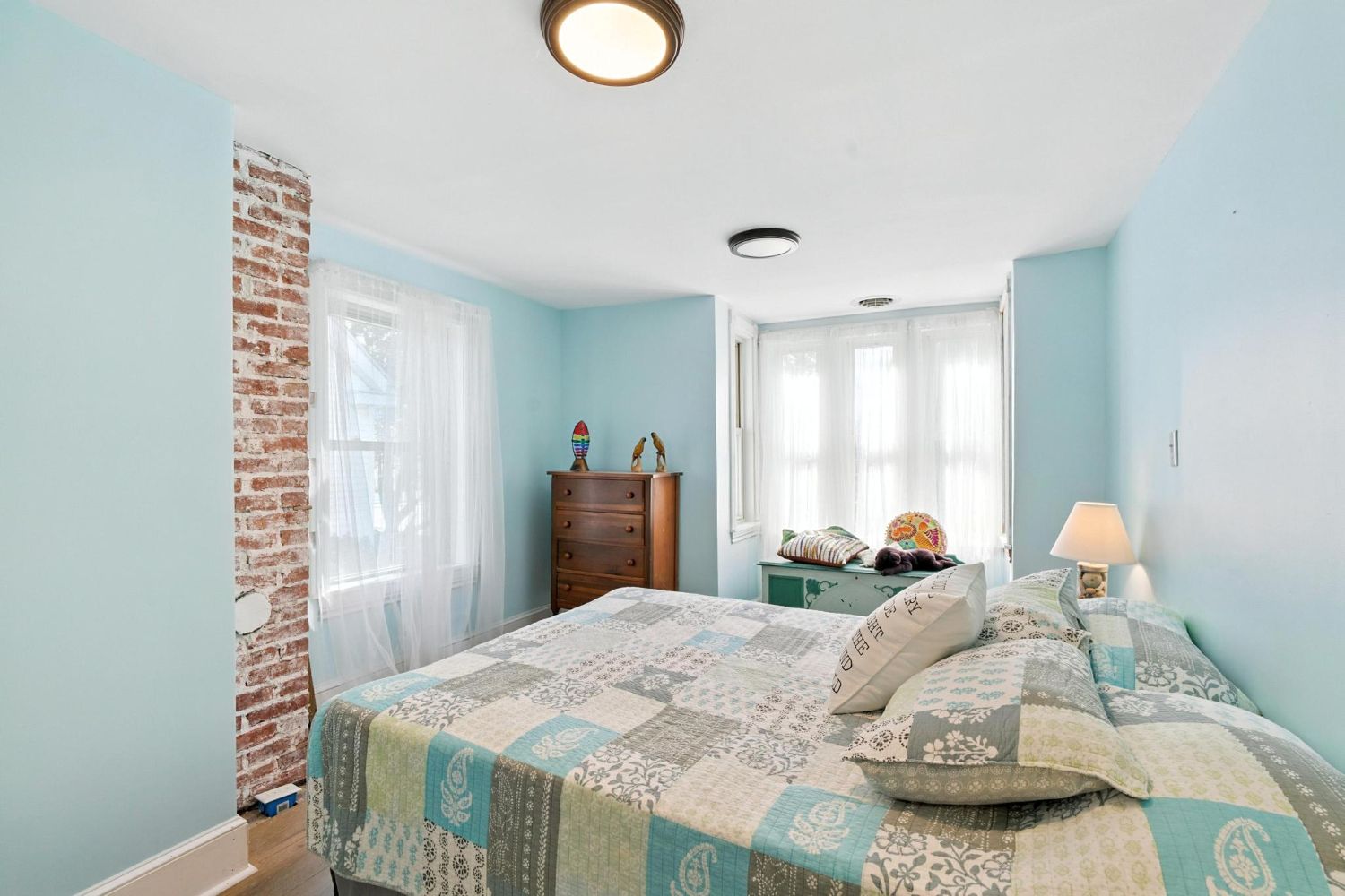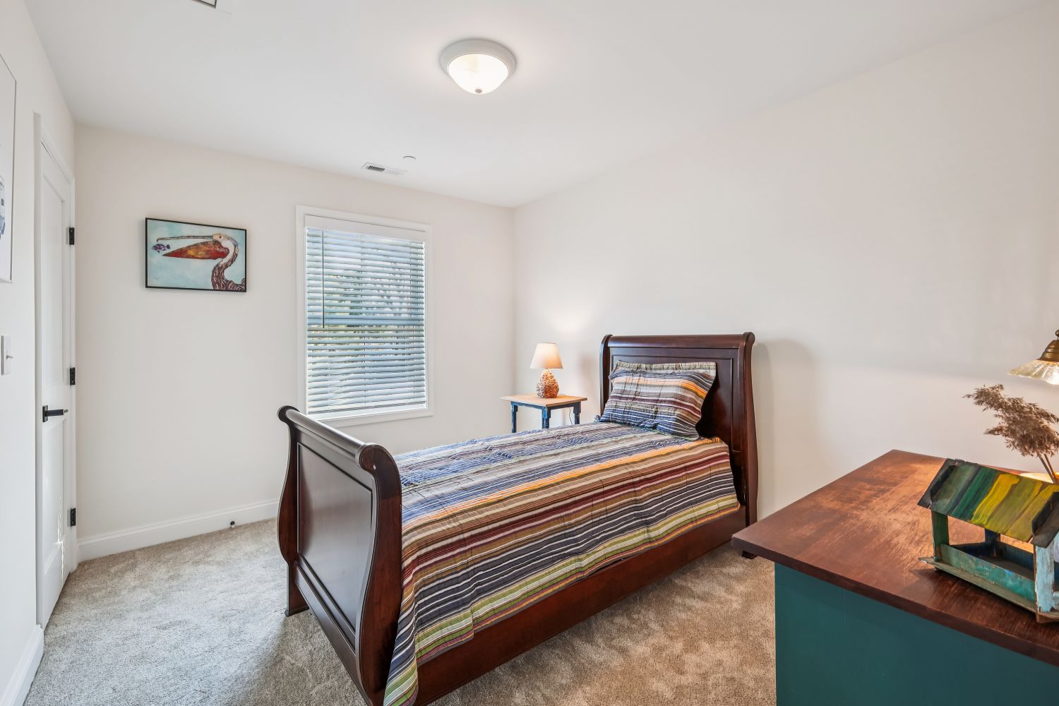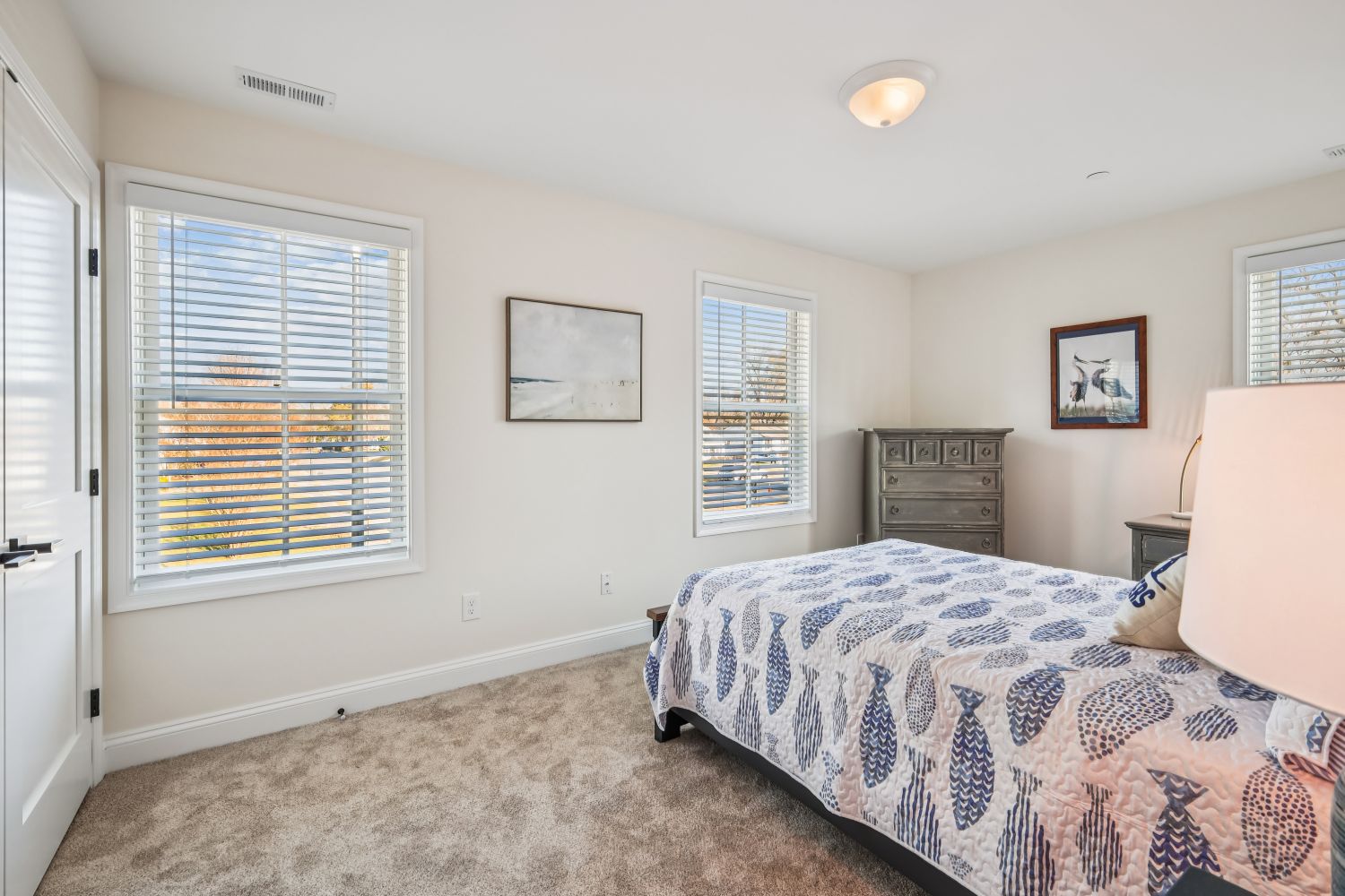 The house is zoned very well with the main floor bedrooms being far apart from each other for privacy. This guest bedroom is located off the secondary hall from the foyer and its large double unit window overlooks the side terrace. The gray walls, colorful duvet and pillows creates a serene spot for sleep.