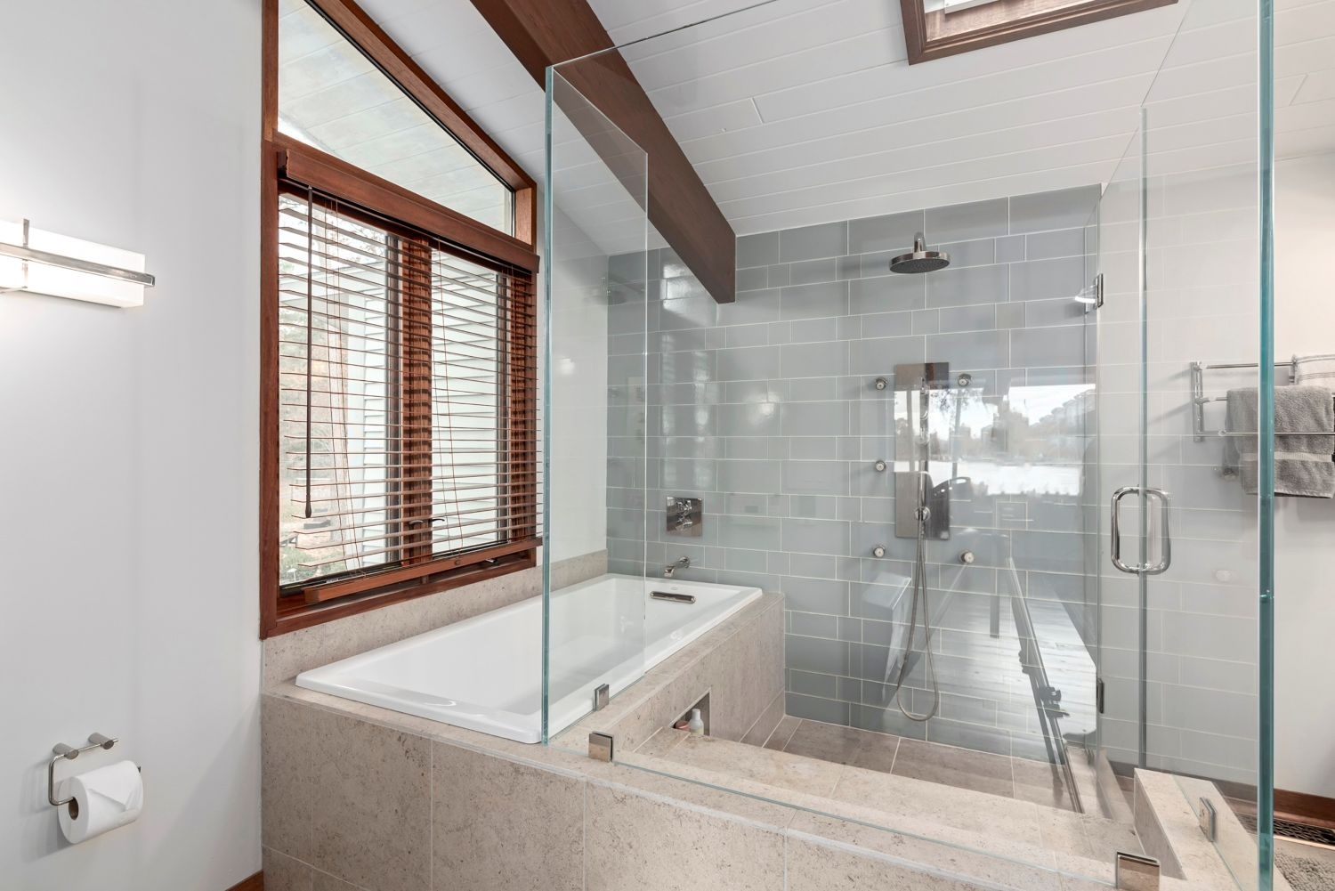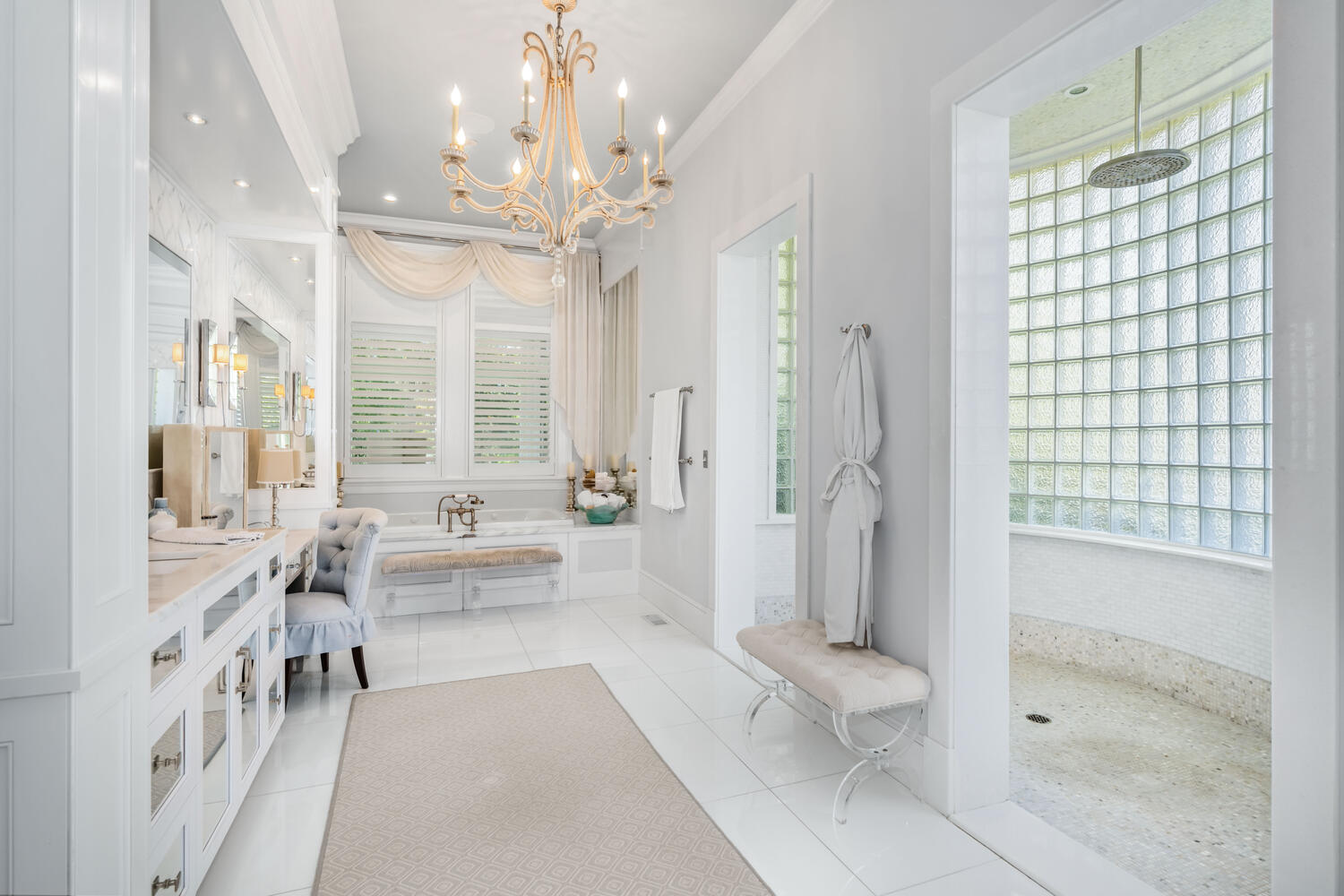 A dramatic glass-block shower wall and jacuzzi tub optimize both light and functionality in the primary bath.