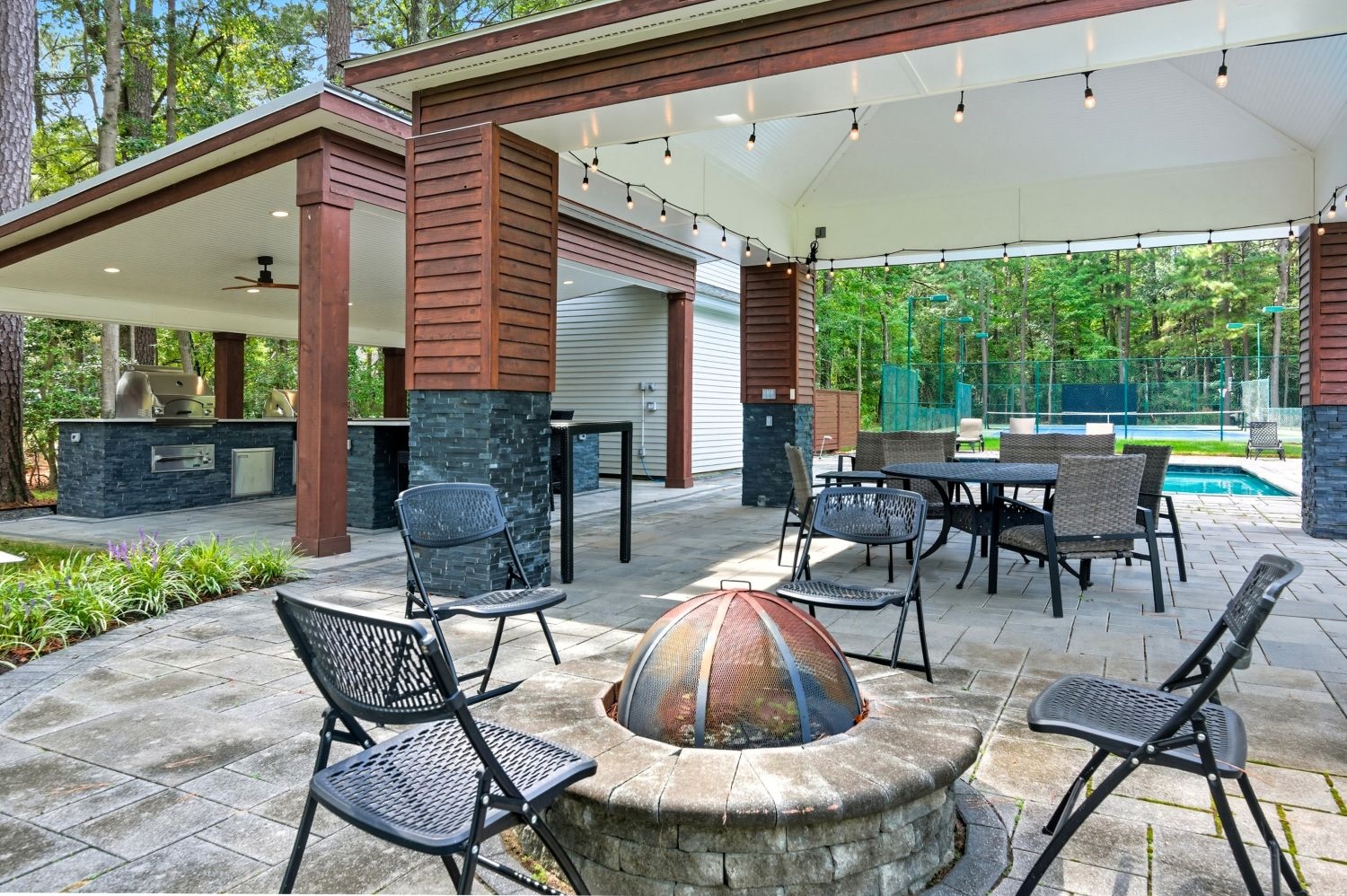 The lagoon-style Gunite pool with waterfall feature is paired with an outdoor kitchen and waterside firepit.