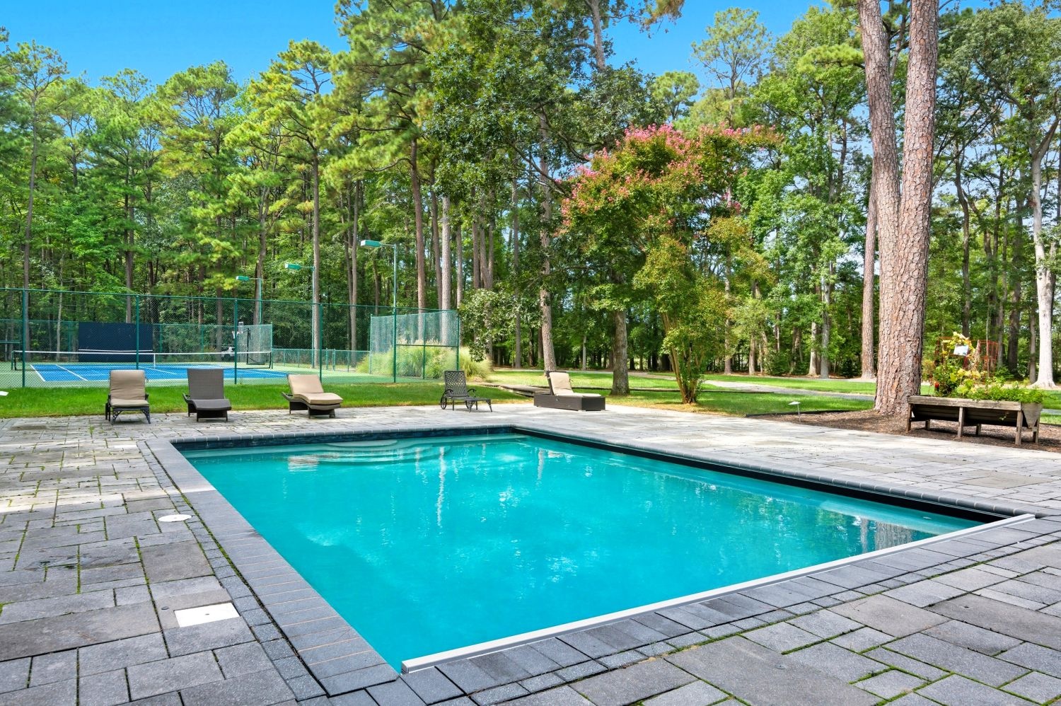 The terrace leads to a twenty foot by forty foot lagoon-style Gunite pool with a waterfall feature, near the outdoor kitchen and a waterside fire pit offering stunning sunset views over the cove. The plantings and mature trees provide privacy.