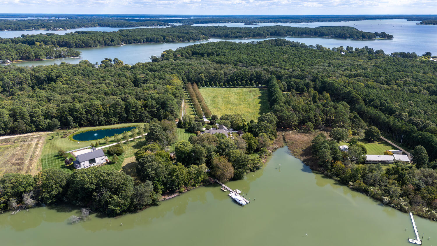 This expansive estate takes full advantage of its prime position along 10+ acres of Caulk Cove’s tranquil shoreline.