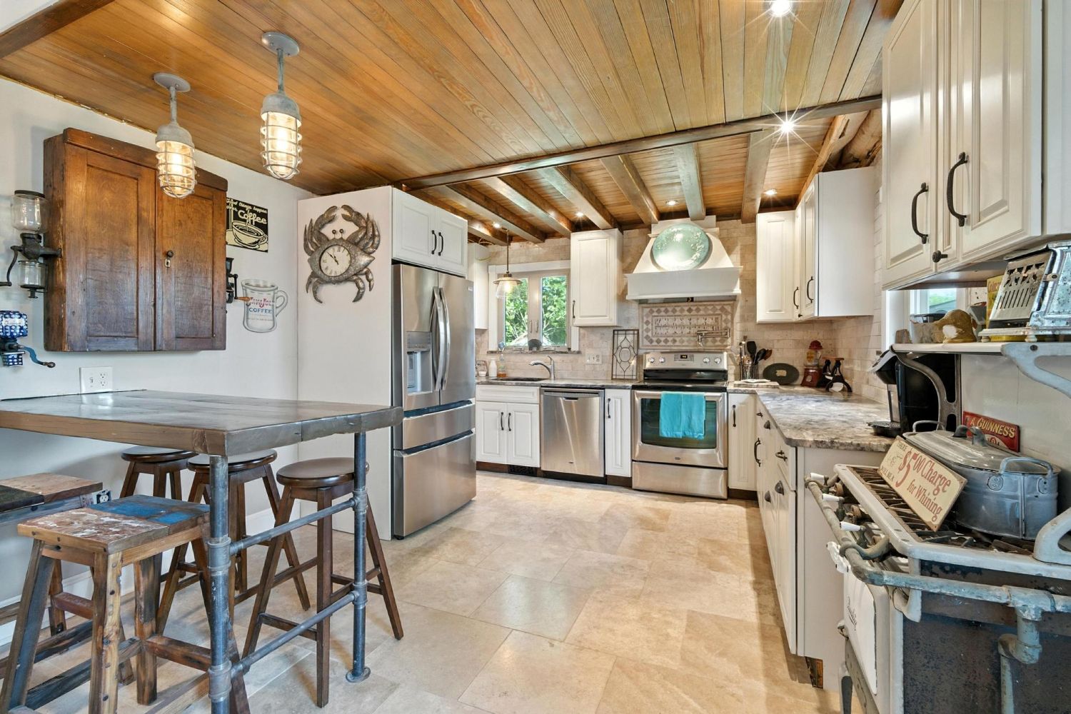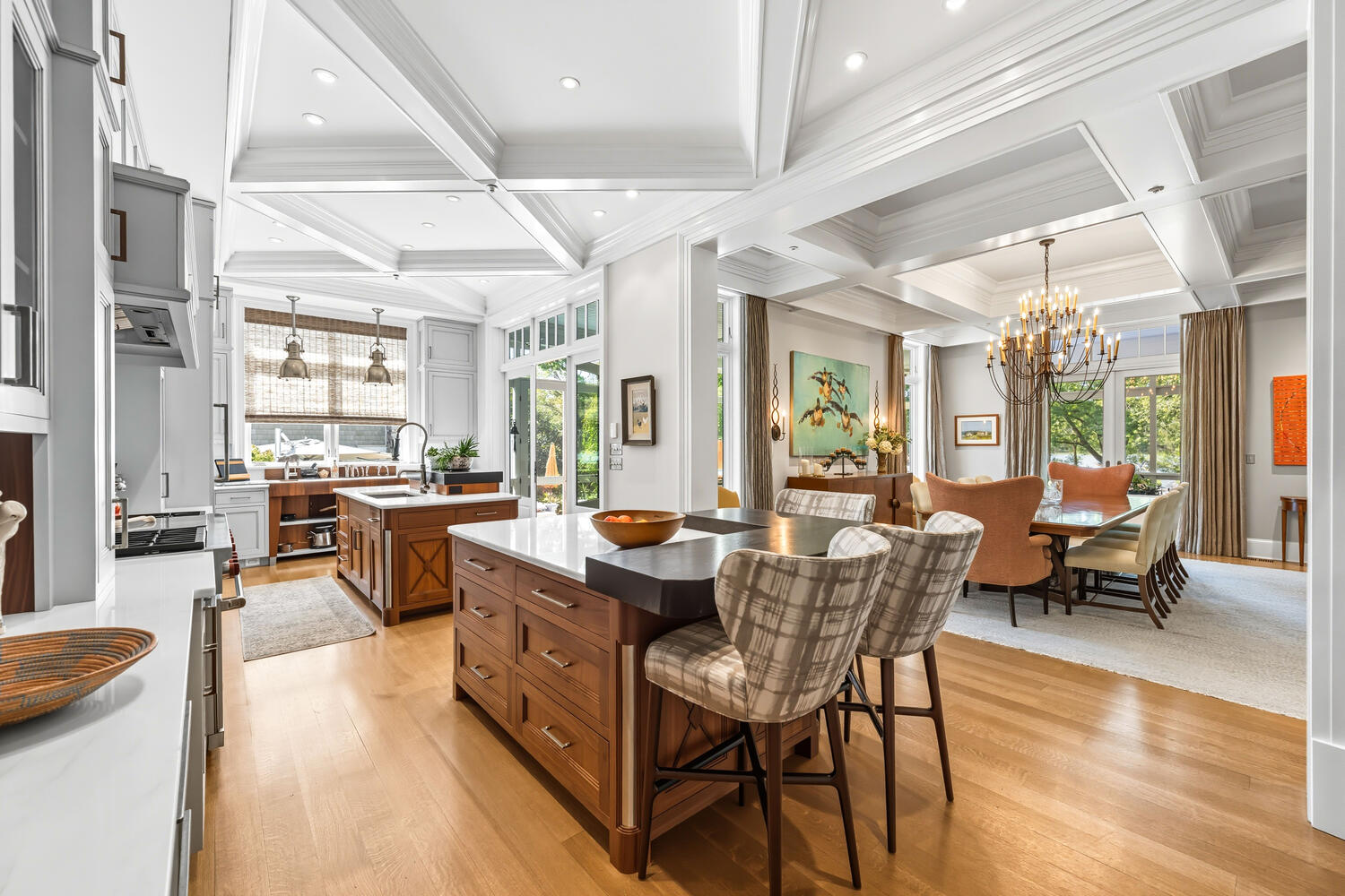 The kitchen’s diamond-patterned coffered ceiling and handcrafted walnut cabinetry make it a show-stopping chef’s haven.