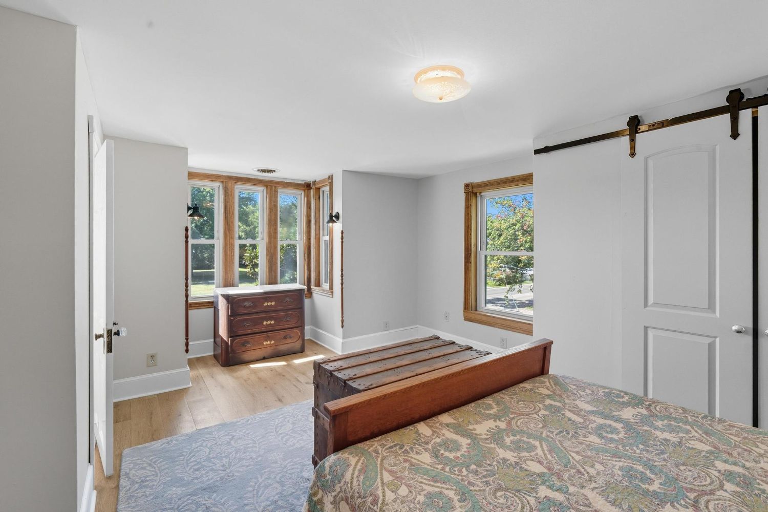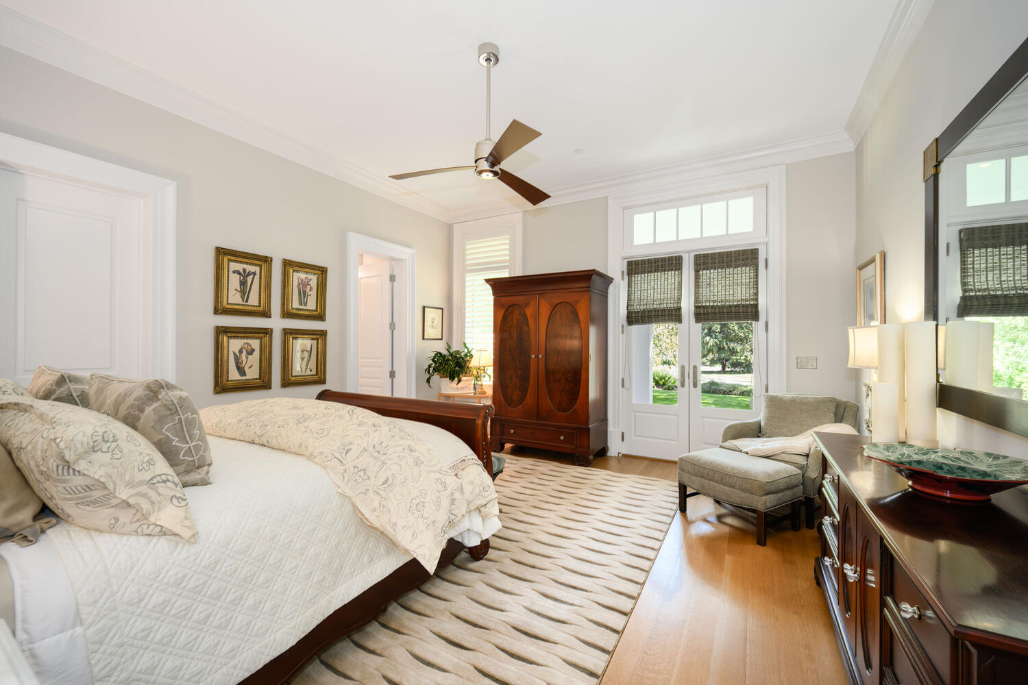 Having explored one side of the house, I returned to the foyer to explore the other guest ensuite and the primary ensuite. If I were lucky to be a guest, I would choose this lovely retreat with its many shades of neutral colors and textures; especially the rug with its raised pile, and the warmth of the wood antiques. I could easily imagine reclining on the chair and ottoman or propping up against the headboard of the sleigh bed for reading before bedtime. Opening up the French doors to the porch would be a delightful way to start the day!