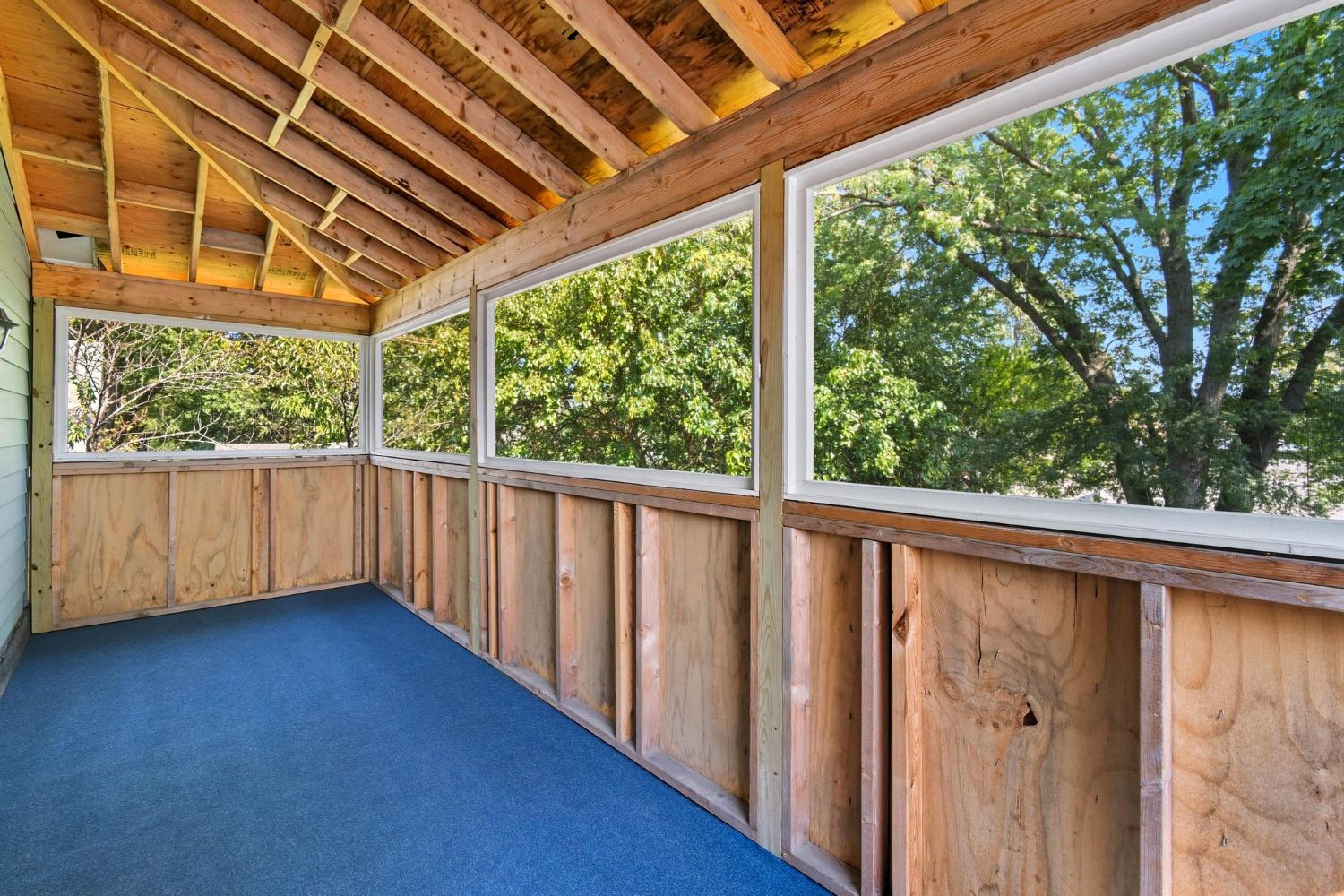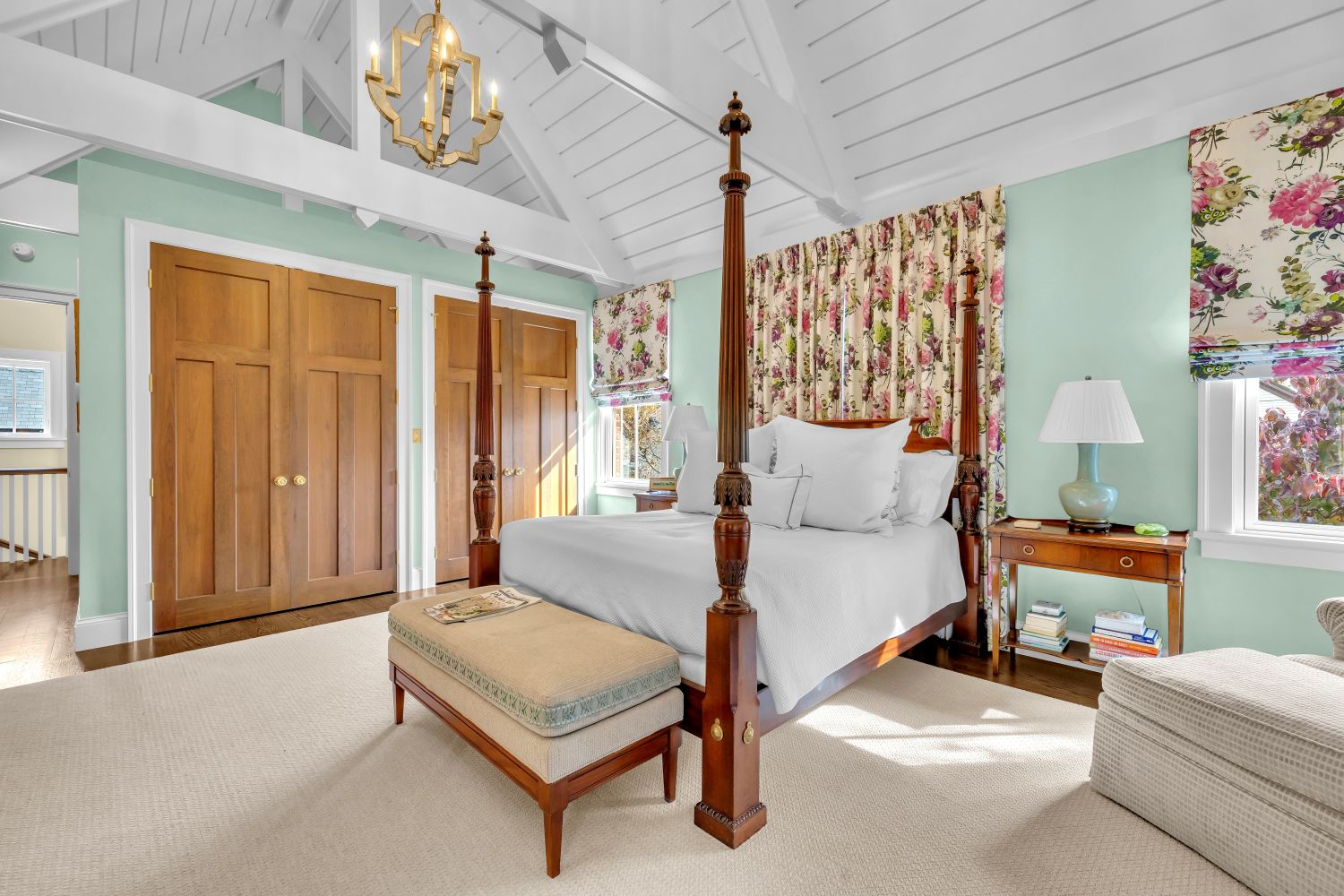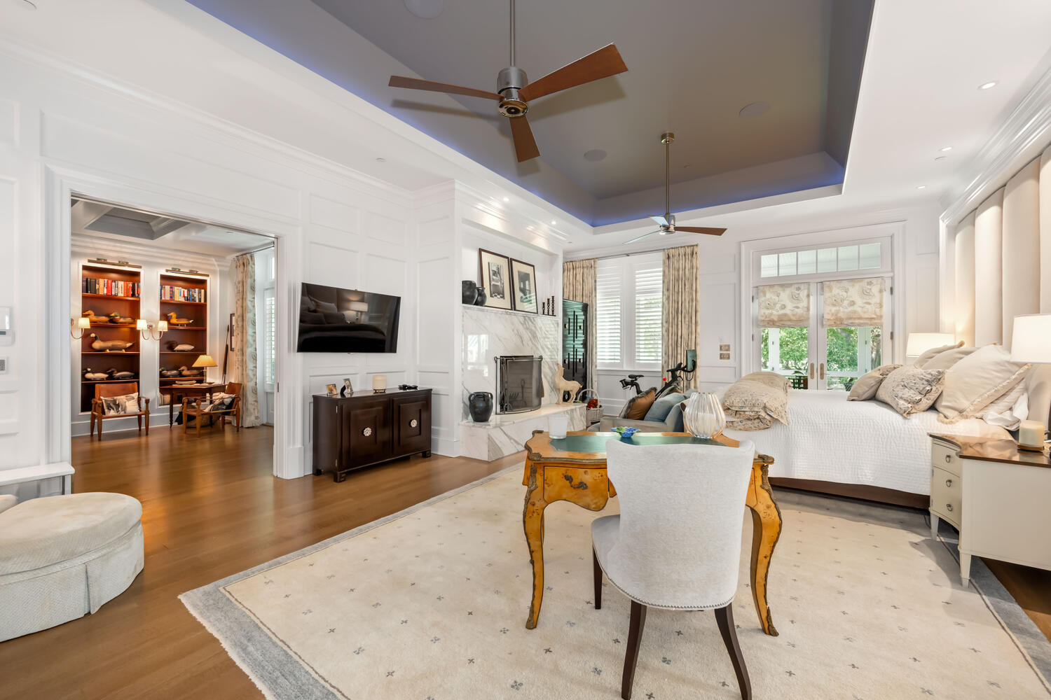 The deep blue tray ceiling and private screened porch set the tone for this relaxing and luxurious primary retreat.