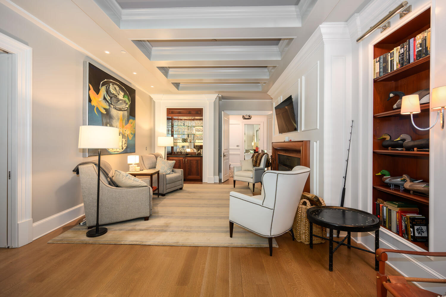 Detailed ceiling coffers and bespoke millwork elevate this functional den, complemented by a fully-equipped bar.