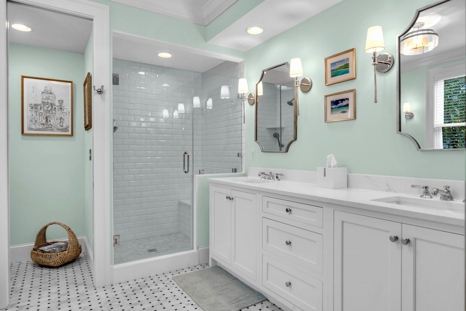 The primary bath is arranged very well with the jacuzzi tub opposite the toilet compartment and the lavatory opposite the large half circle shower with its exterior wall of glass block that floods the space with daylight. The mirrors above the lavatories captures views of the glass block wall.