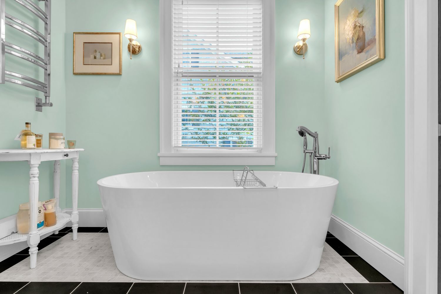 The primary ensuite’s private screened porch has a pair of doors leading to steps down to the lawn. With options for relaxing on the chaise or enjoying breakfast at the round table, this delightful space is a bonus room for the primary bedroom. Hardware was installed for a bed swing-perfect for warm summer nights!