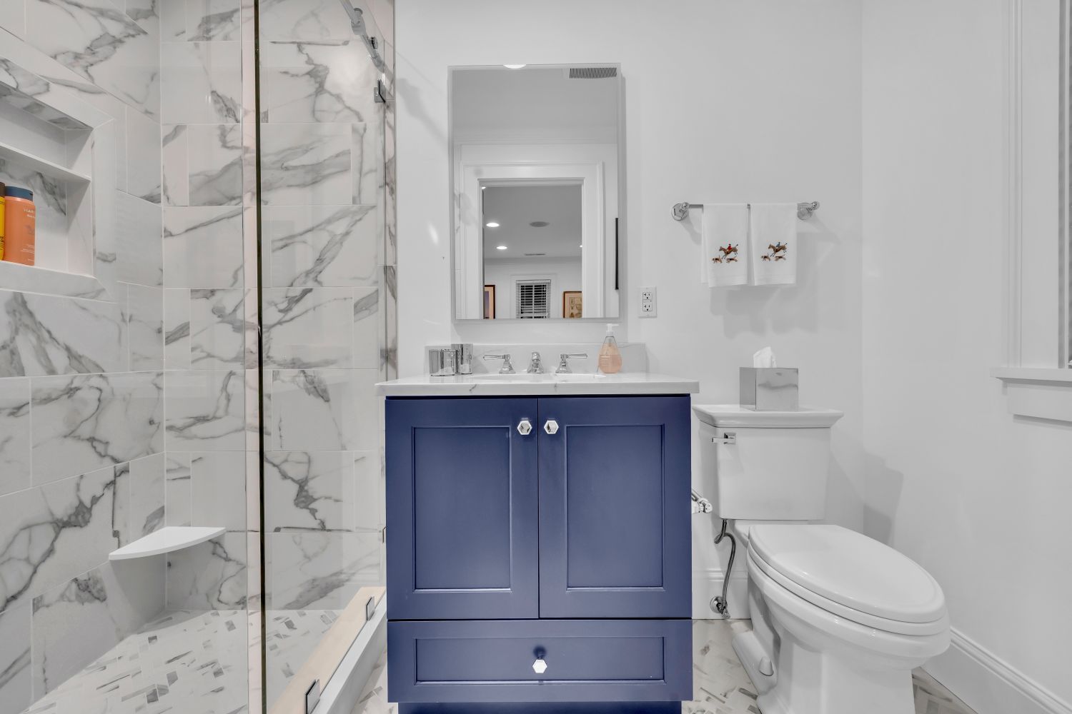 A 12-foot ceiling, bespoke millwork, and stone accents create a grand yet welcoming entry into the home.
