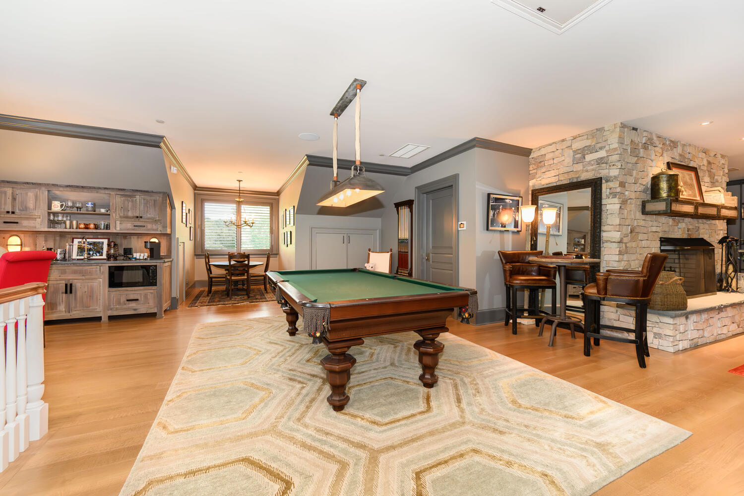 The second-floor recreation room features a stone fireplace, a billiards area, and multiple seating options for gatherings.