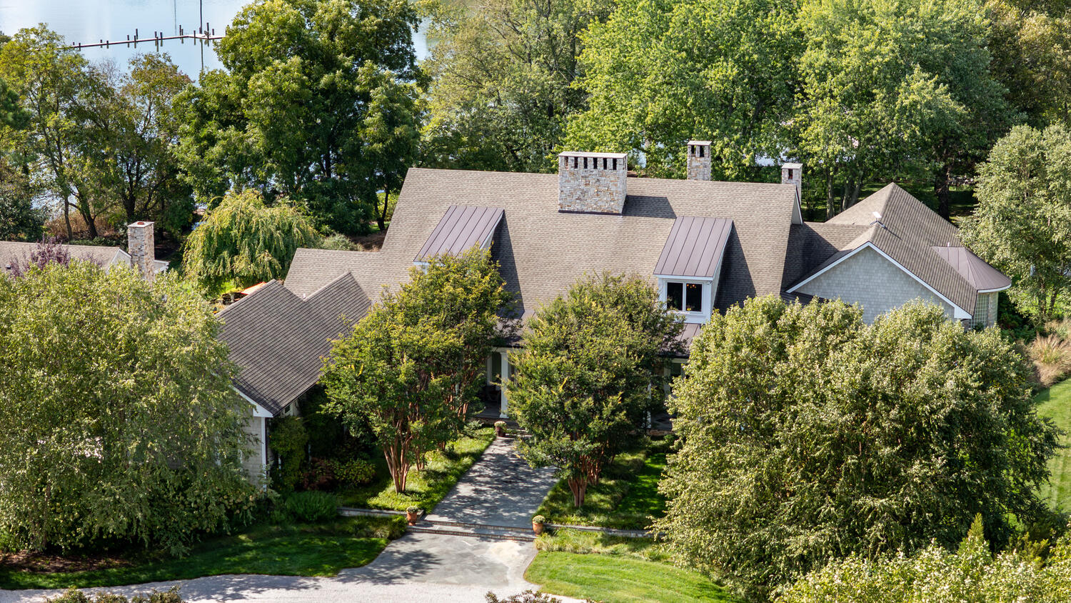 Distinctive massing with steep rooflines, shed dormers, and gable wings blends seamlessly into the surrounding trees.