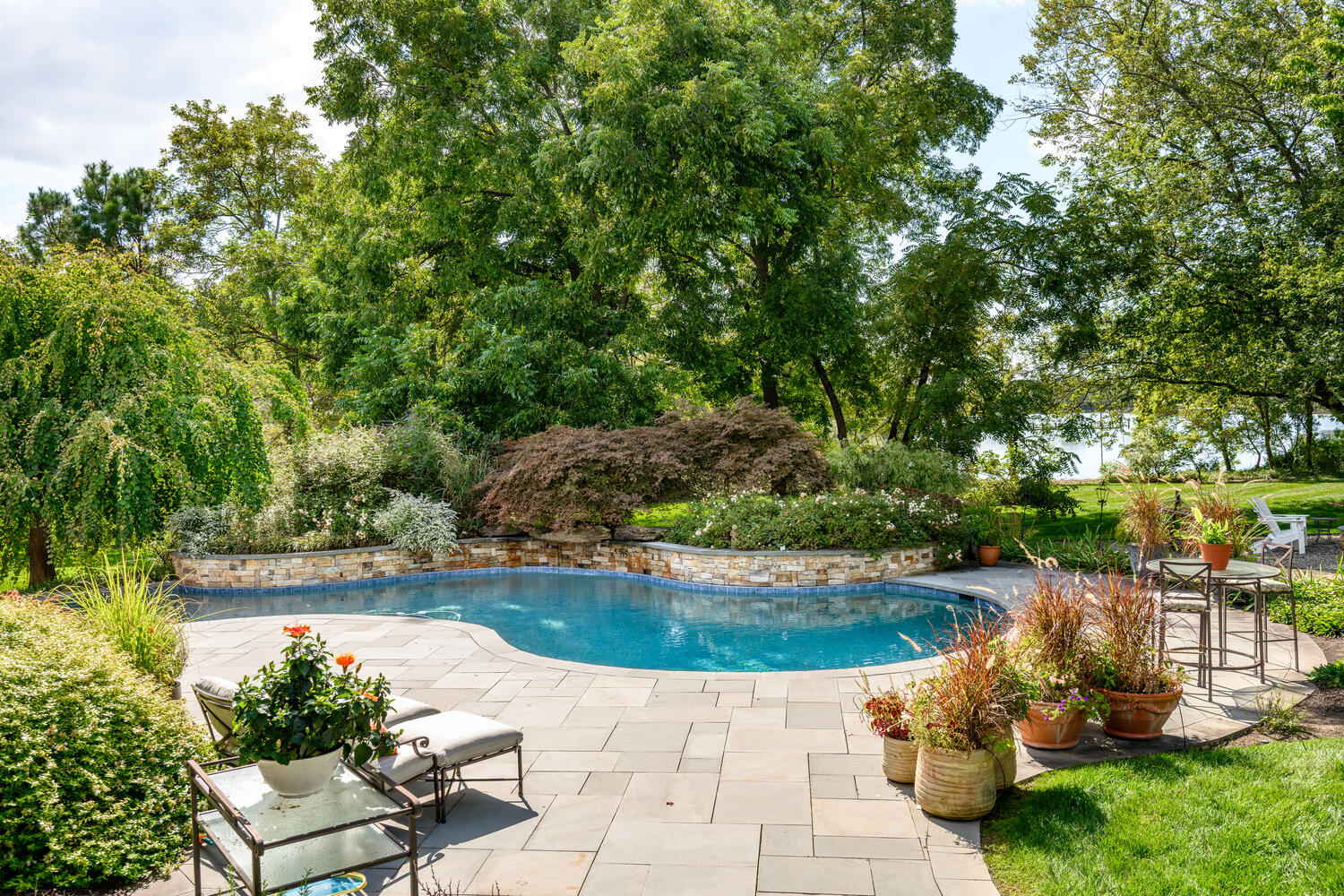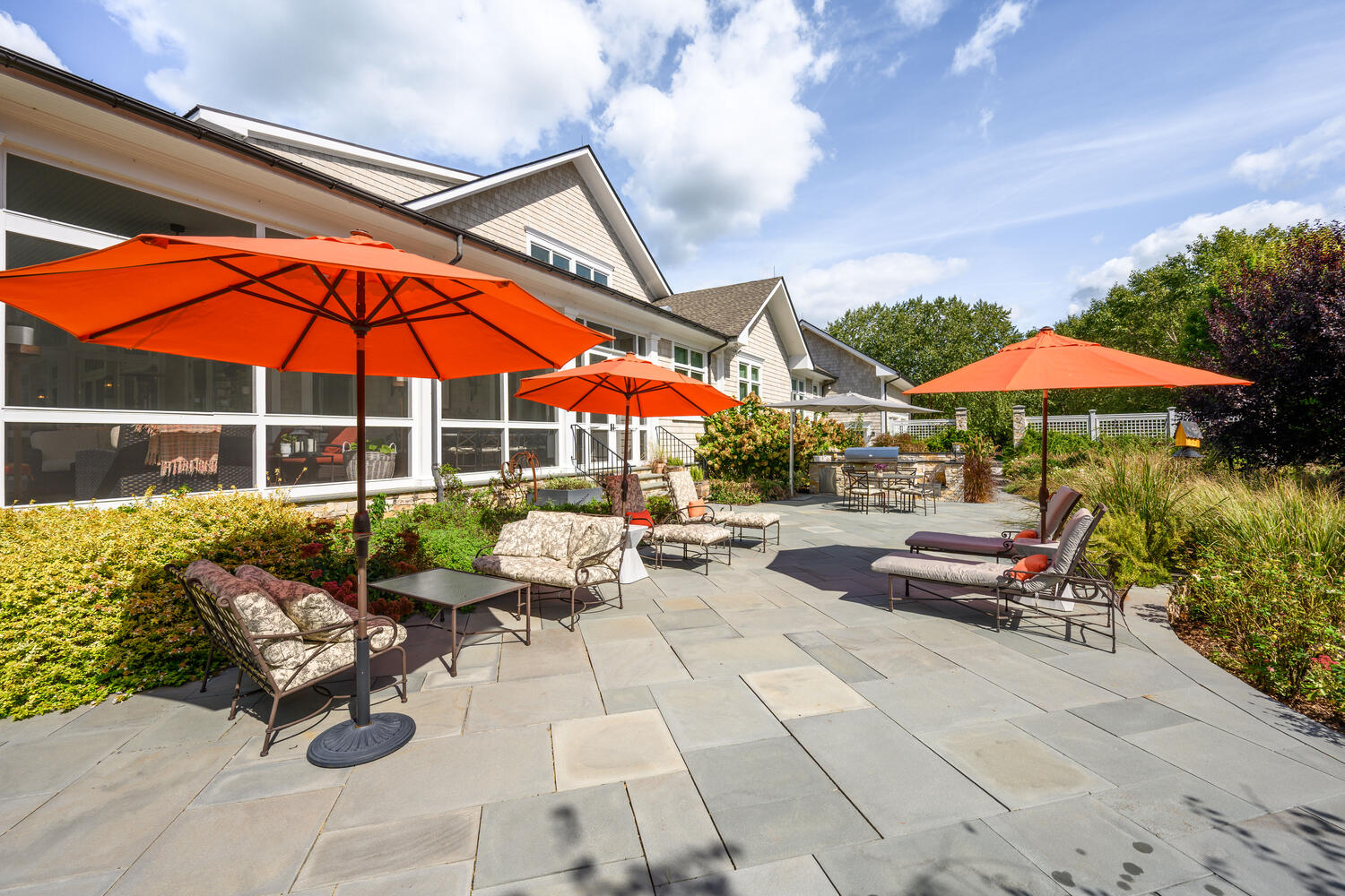 Bluestone walkways and irregular terrace edges enhance the natural aesthetic of the lushly planted outdoor spaces.