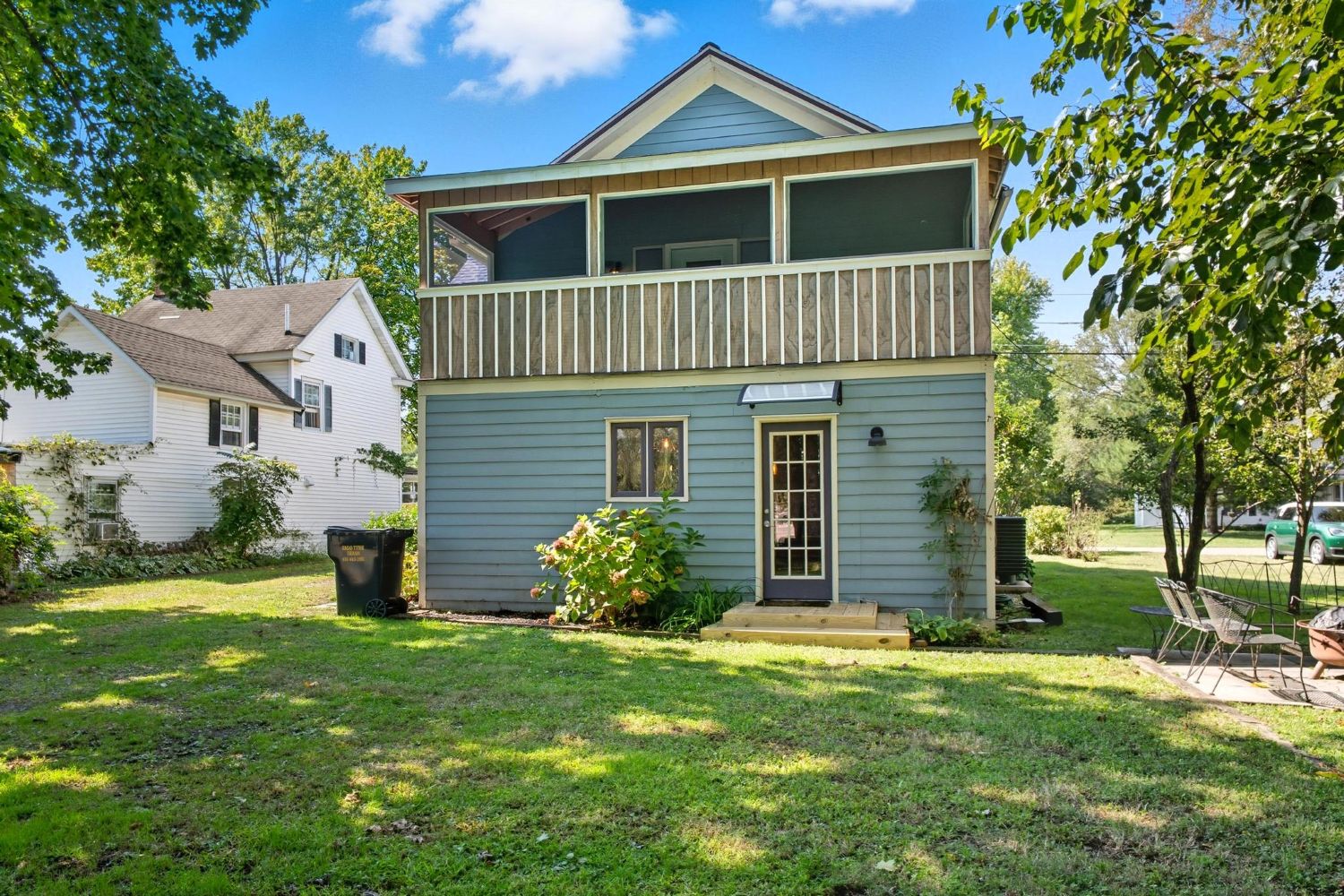 A private screened porch with lawn access and a bed swing creates a peaceful extension of the primary suite.