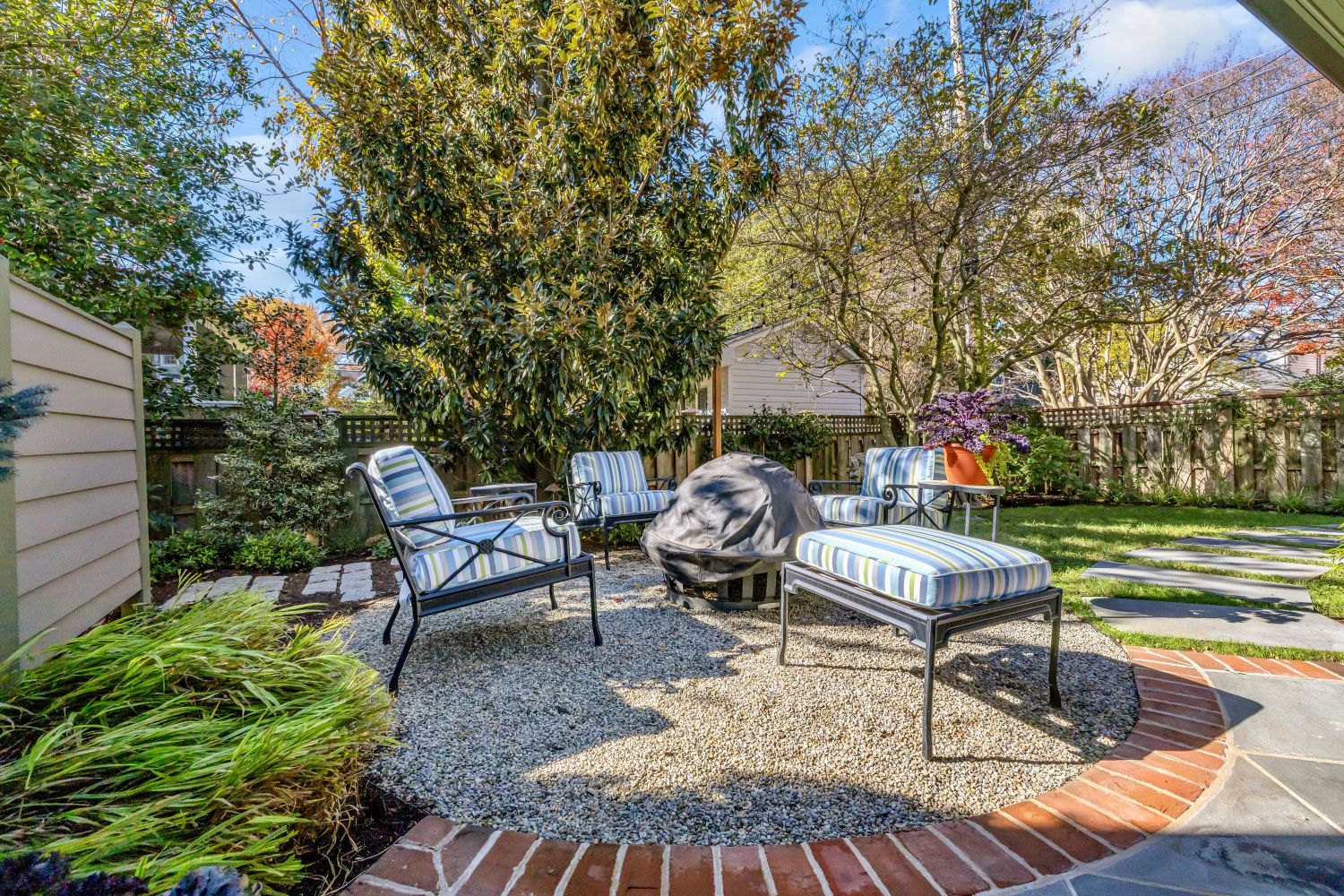 Steps lead down from both the open porch and the screened porch to bluestone walkways and terraces. The irregular outlines of the terraces blend into the lush plantings.
