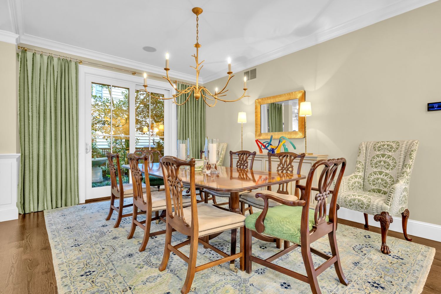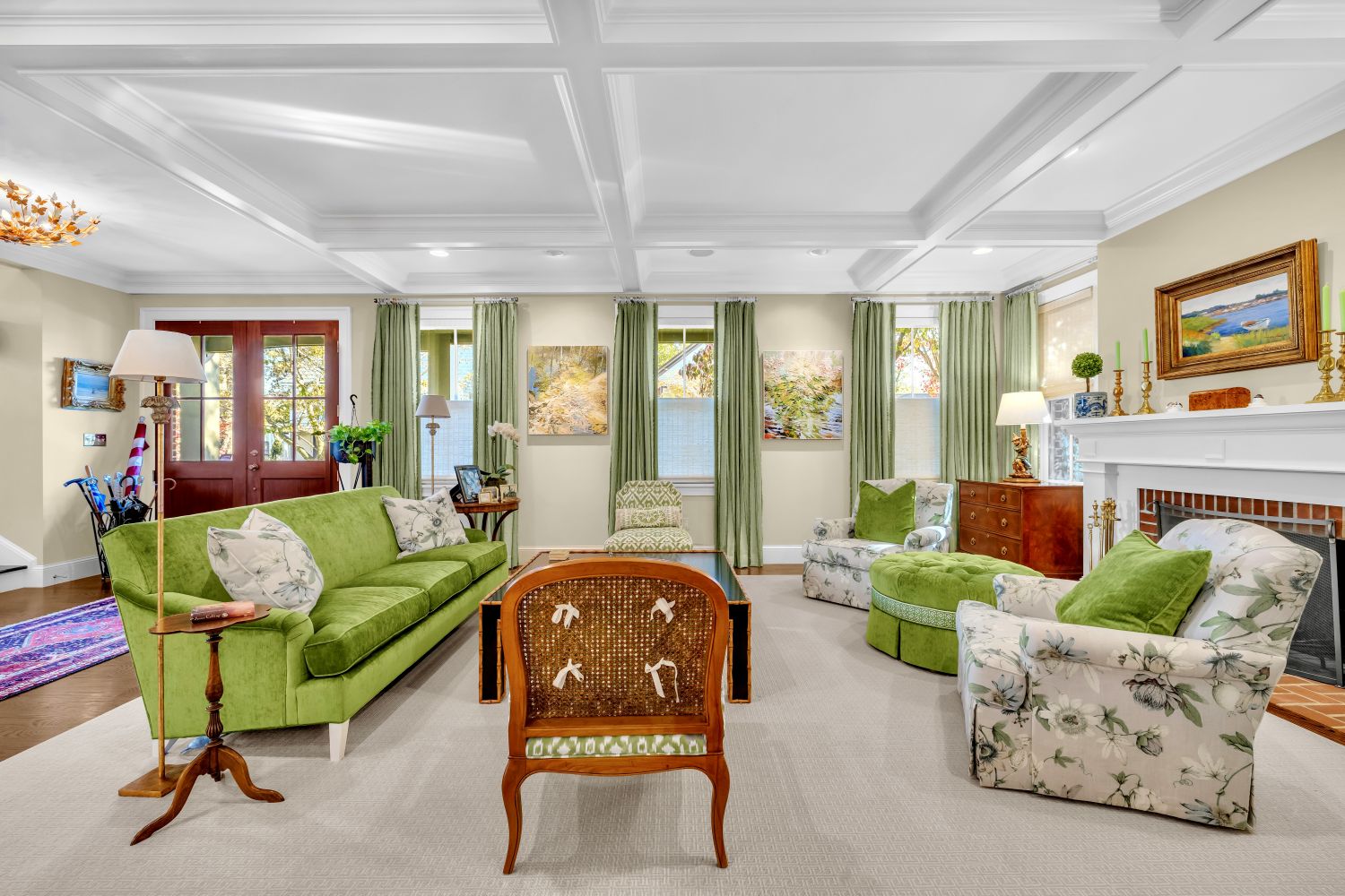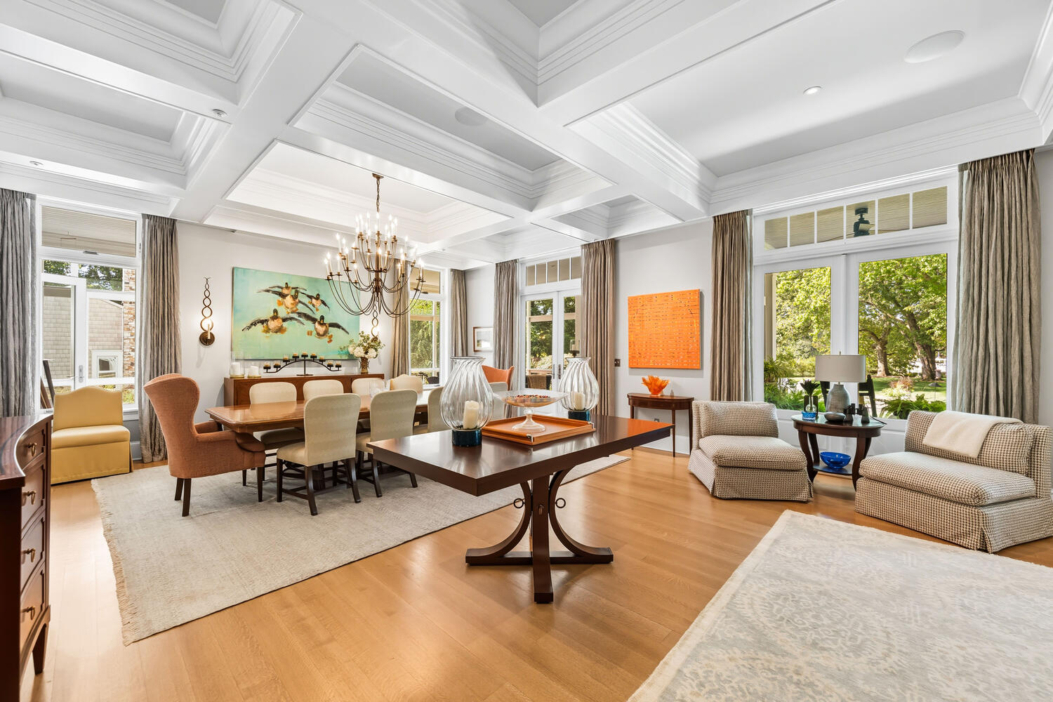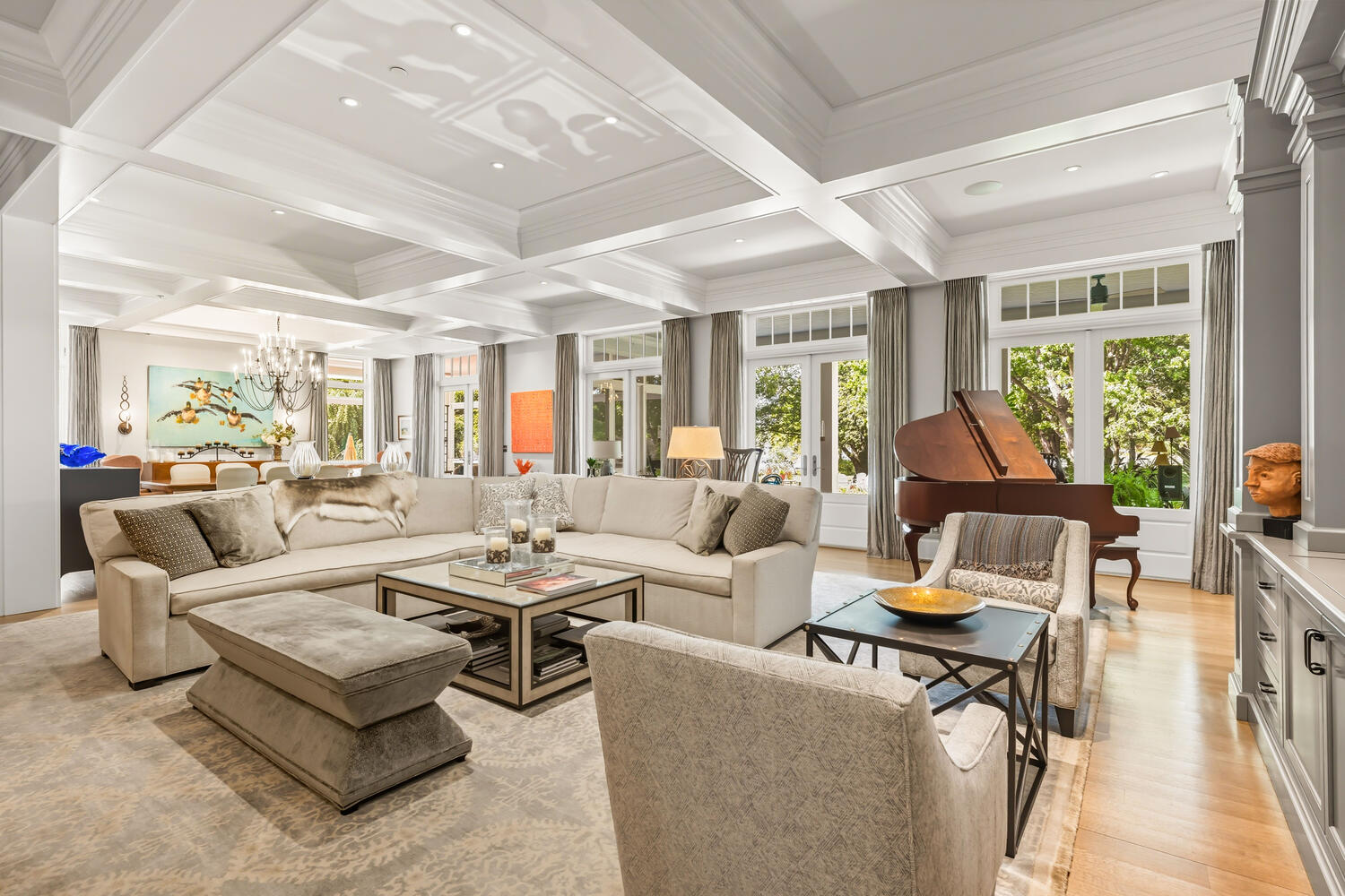 At the rear wall of the open plan living-dining area, pairs of French doors with transoms and windows rise to the underside of the coffered ceiling. Full height window treatments provide privacy when needed.