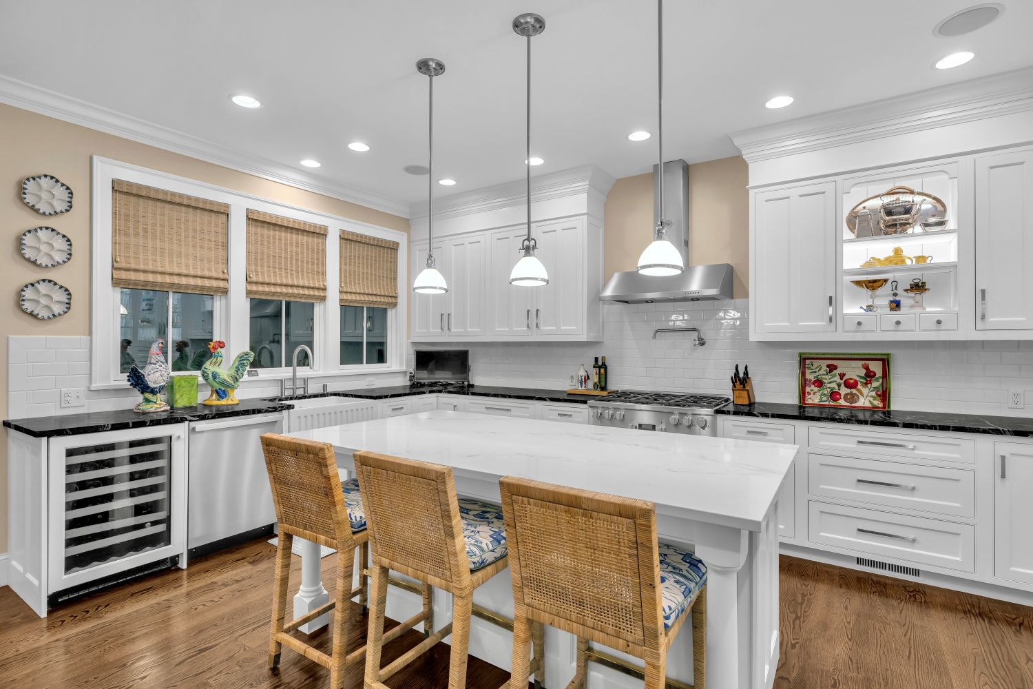 Behind the kitchen is a fully equipped butler’s pantry with extensive cabinetry, generous counter space, a secondary refrigerator and sink, dual dishwashers, a wine refrigerator and an electric oven. A combination of open shelves for cookbooks and glass fronted upper cabinets for storage of serving pieces, crystal and china completes the design. The wide wall opening leads to the front hall’s French doors to access the front porch.