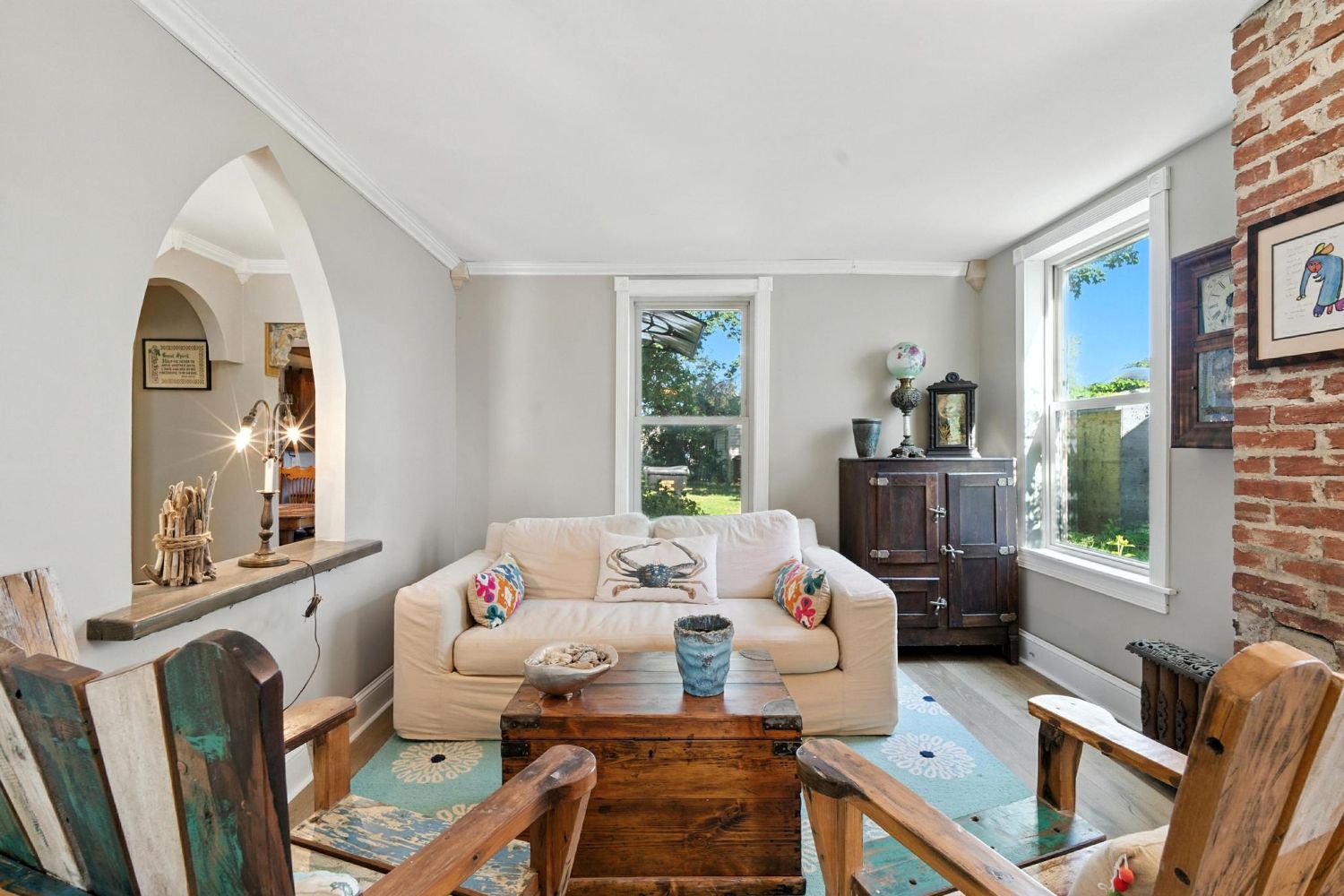 To begin my tour of the interiors, I went back to the front porch, where the Owner and Listing Agent met me at the large foyer that is the same length as the adjacent living room’s width. Being an architect, I noticed how carefully this room’s interior architecture was designed. Layers of trim on the drywall create a grid of both solid wall planes that blends into the transparency of the sidelights and transoms of the wide pair of doors. I especially appreciated the accents of the chimney’s stone wall, the rich “Hermes’ Orange” bespoke millwork that is a backdrop for a settee and an antique bench and the texture of the “pebble” rug. Soaring twelve foot ceilings and rich hardwood floors were harbingers of the materials that I found throughout the main level of the house.