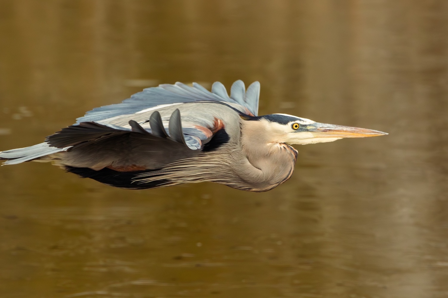 A Breat Blue Heron glides home in the Blackwater National Wildlife Refuge.
