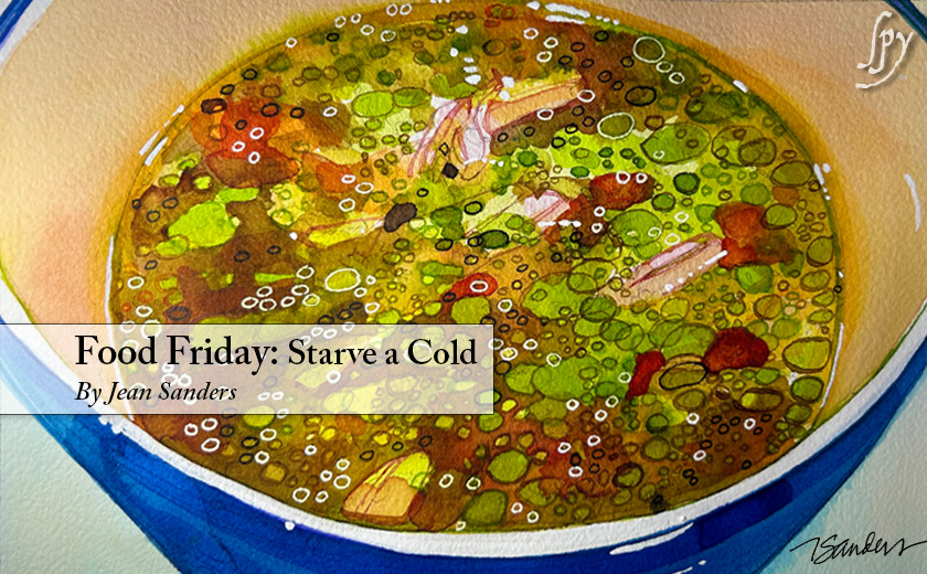 And that is how Food Friday usually spends our Wednesdays – research in the field, getting ideas, sound bites, tiny samples and quick impressions of what other people are buying to make for their dinners. This week Mr. Sanders has been sick with a rather loud, stinking head cold. We have not been discussing the notions of timely, economical winter cooking. There have not been any thoughts of Boeuf Bourguignon; no Creamy Garlic Chicken, no Braised Short Ribs, nor any meatloaf, Shepherd’s Pie, Chili or Squash and Sausage Gnocchi. Nope. None of them. What we have had around the clock is chicken soup. Lots of chicken soup. Steamy, cold-busting chicken soup. No wonder I was thrilled to pieces yesterday to get out of the house and spend a quality afternoon sitting at the DMV.